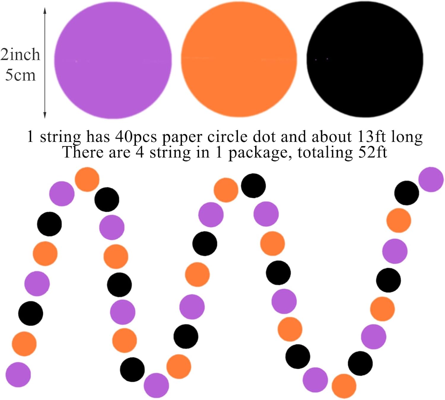 - 【Package Including】The decorations kit include 4 pack paper garland in 3 colors Black Orange Purple,each garland is approx 13 feet in length,totally 52 feet in length.Each one has 40 pieces of circle dots 1.97".