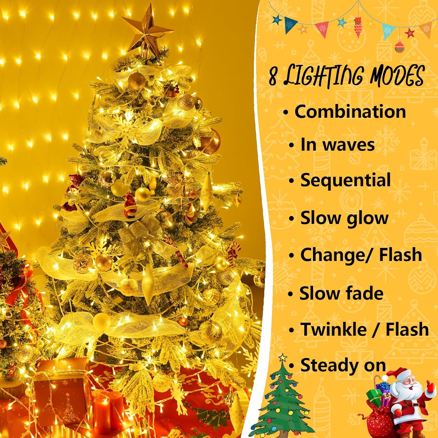 - 8 Lighting Modes: Christmas lights has 8 lighting modes (combination, in wave, sequential, slo-glo, chase/flash, slow fade, twinkle/flash, steady on). Different lighting effects are controlled by the adapter button. Change the mode as needed to attract and surprise your neighbors! Christmas lights will be a eye-catching decoration at your party.