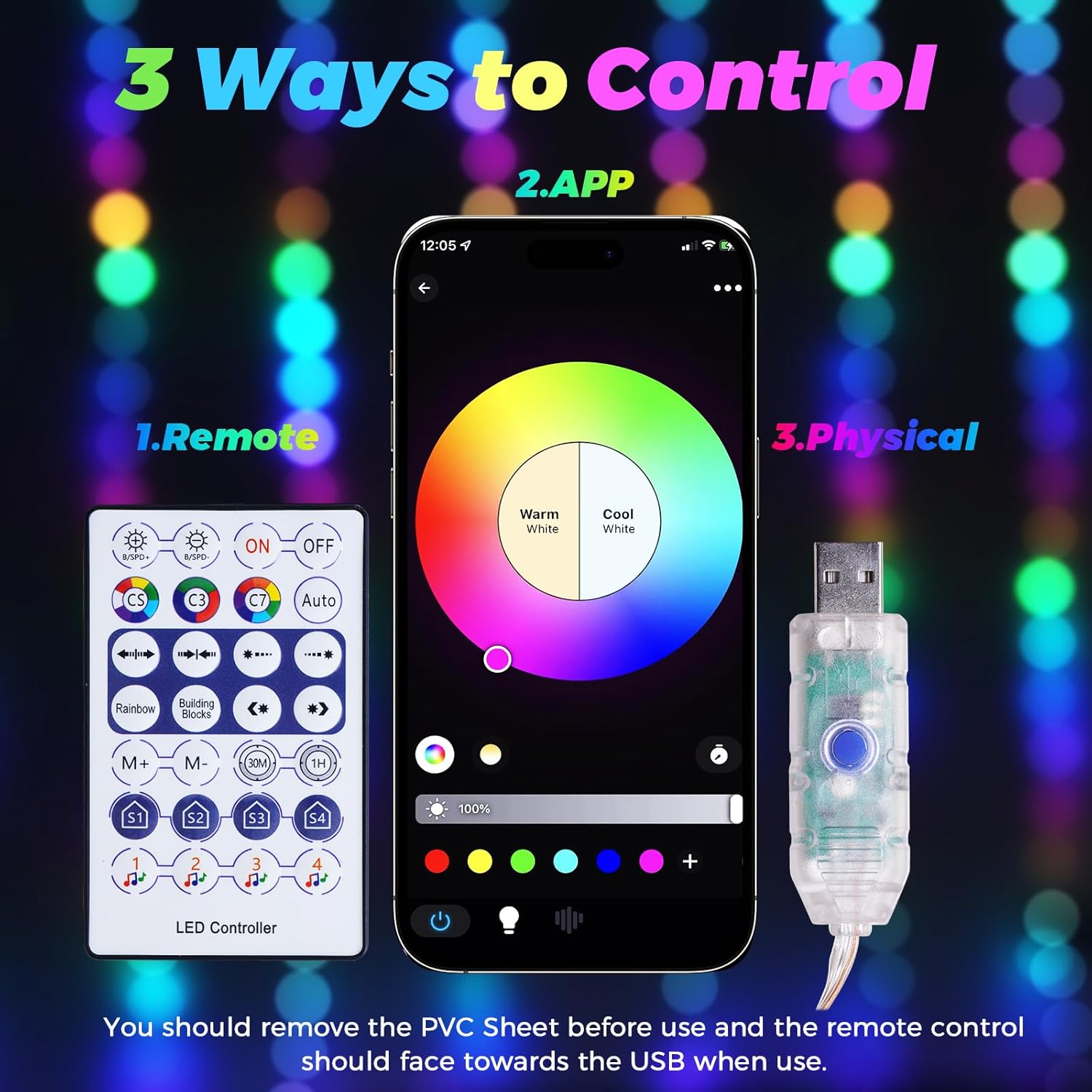 - Three Ways to Control: The USB has an button that can change static color. Except change static and dynamic color, the remote have more functions which can change modes and set timer. The fairy curtain lights can display more color that the remote not contains by app