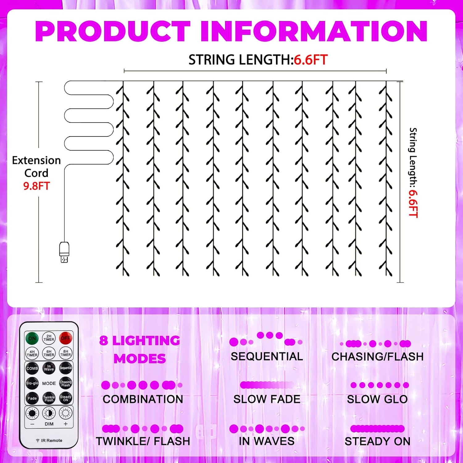 - Tangle-Free Curtain Lights: 200 super bright LED bulbs, the 6.6x6.6Ft curtain lights come with a 9.8Ft extension cord; With 10 drop light strings, each holding 20 LEDs, and convenient hooks at the top for easy hanging, they effortlessly add warmth and sparkle to any room, creating a dreamy, fairytale ambiance that fills your space with joy and serenity