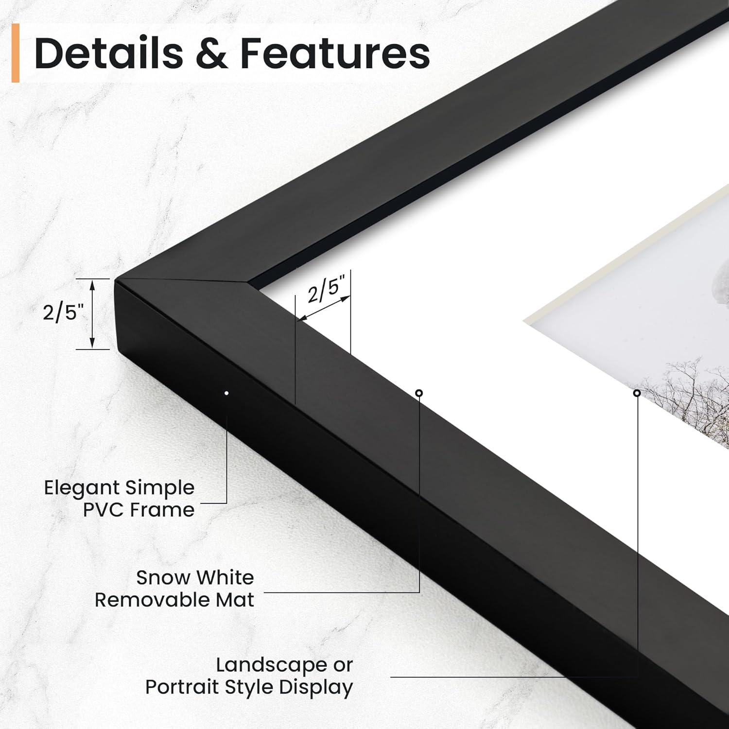 - Display Precious Memories - Showcase your cherished moments with our 11x14 plastic frame. It's lightweight yet sturdy with a superior quality finish. The white mat opening (measuring 7.5x9.5) is perfect for a 8x10 picture with the mat, or an 11x14 picture without it.