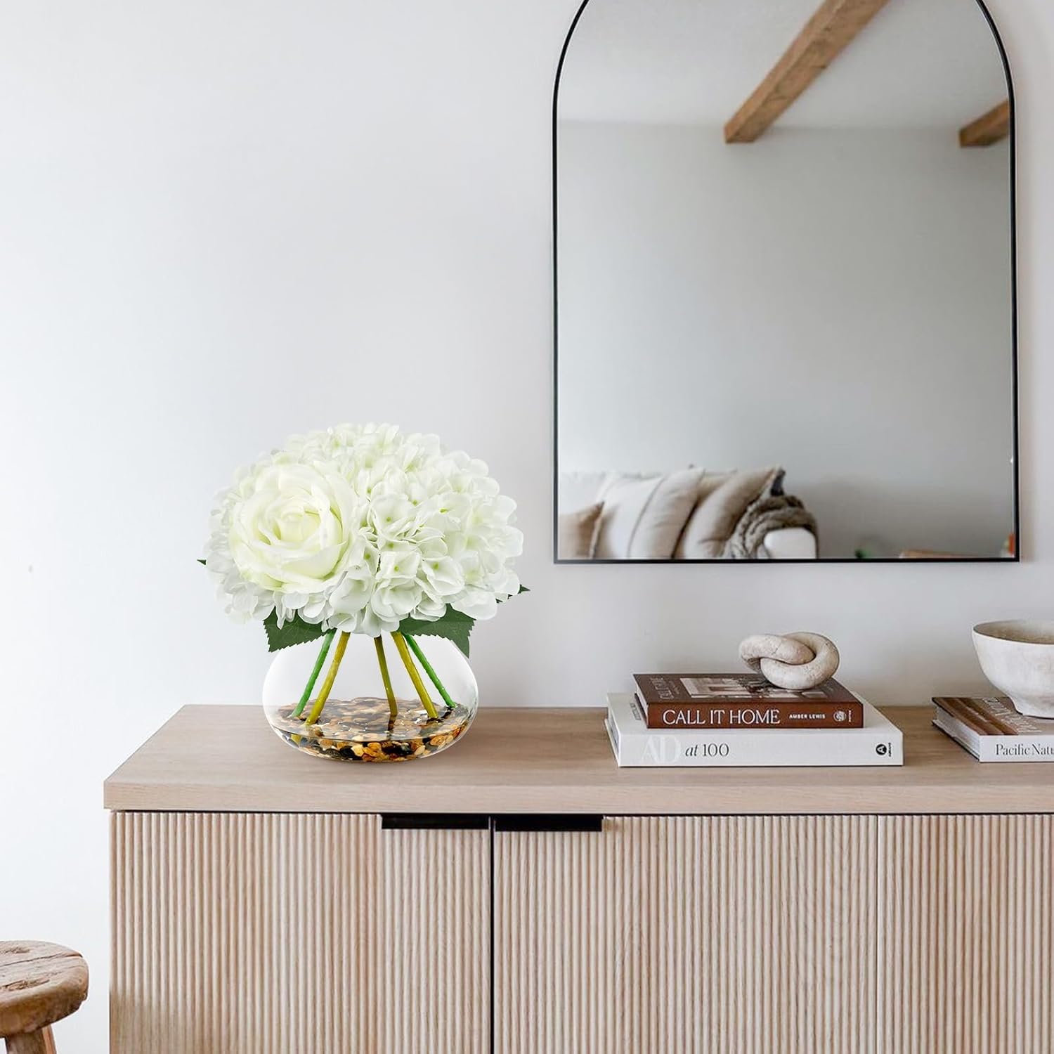 N&T NIETING Artificial Hydrangea Flowers with Vase White Fake Flowers with Rose Faux Hydrangea Flowers with Faux Water Real Stone for Home Office Table Room Wedding Centerpiece Decorations