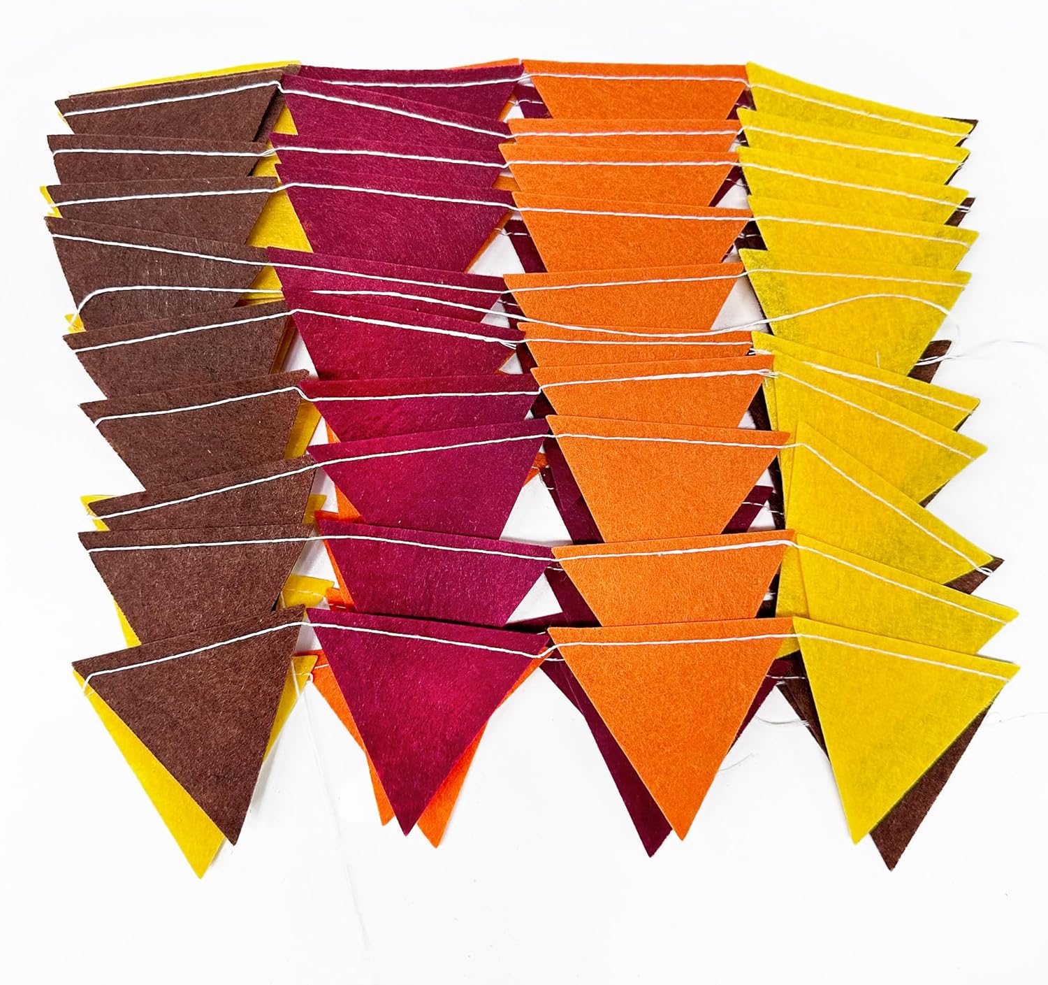 - 🟡Easy Assembly - Easy hanging and reusable.Perfect fit for fall party decor.unroll and unwrap garland carefully. due to delicate nature of thread, may tangle.This mini triangle pennant makes an attractive backdrop for videos and photos.