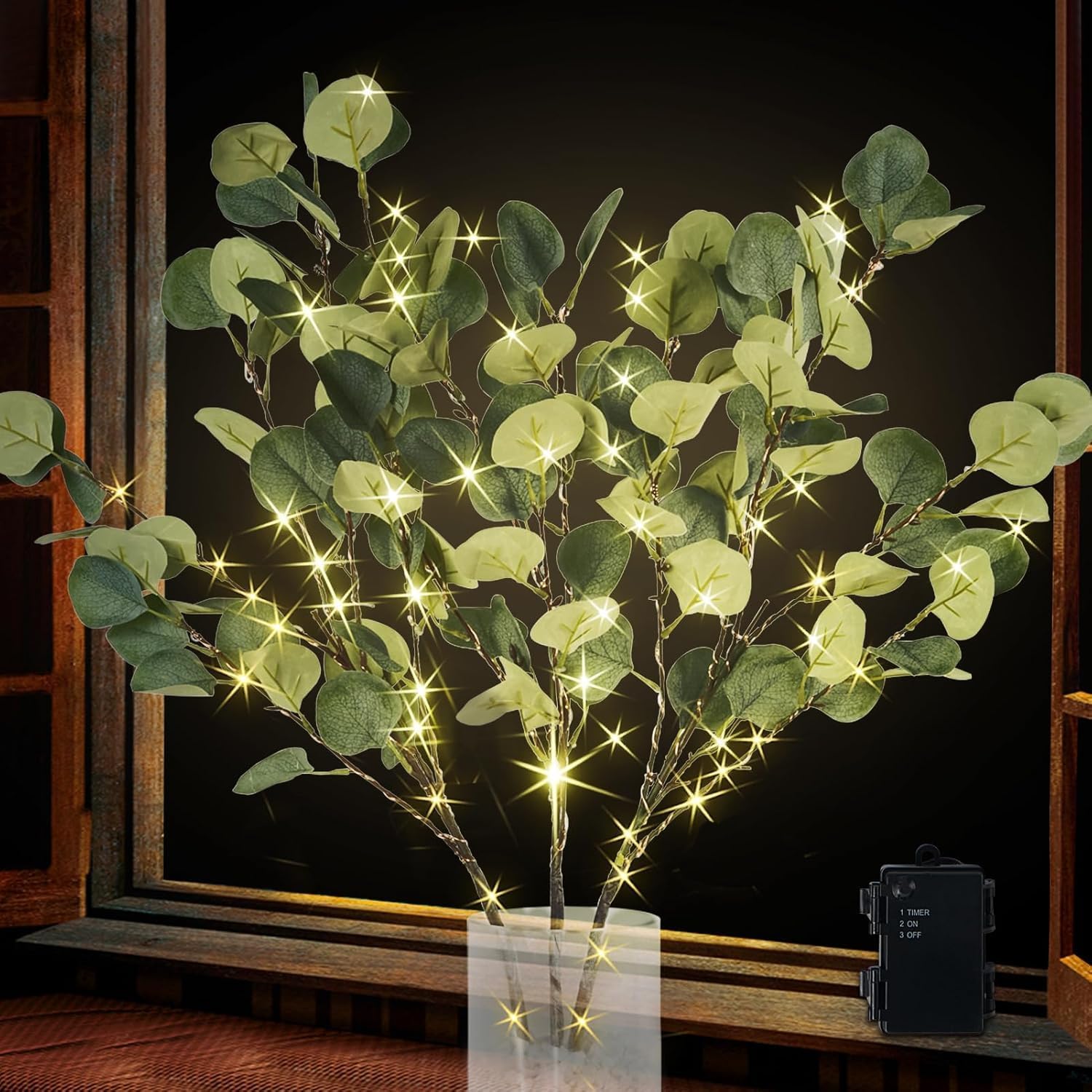 Lighted Eucalyptus Branches with Timer, Lighted Branches 33IN 99 LED, Artificial Light, Eucalyptus Night Light, Artificial Plant for Home Spring Party Wedding Decor-Battery Operated, Home Decor
