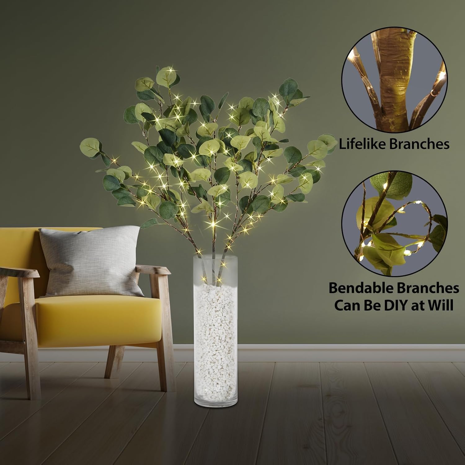 - 🎄【You can DIY】The lighted eucalyptus branches are 33in high and contain 99 warm white LED lights. The texture of these eucalyptus-lighted branches is soft and sturdy, it is easy to bend into any shape. You are free to DIY into what you want, you can also put some Christmas, Easter, and other festive decorations on the lighted branches to decorate it