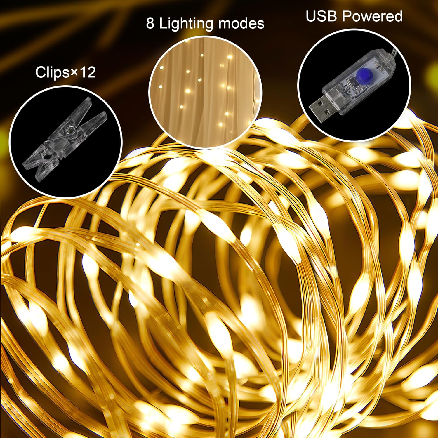- Package Includes: The package includes 2 panels soft champagne curtain with lights, each panel tulle backdrop curtain size is 5FT width and 8FT height, a set of 10ft warm white string light (USB Powered) and 12pcs Transparent clips.