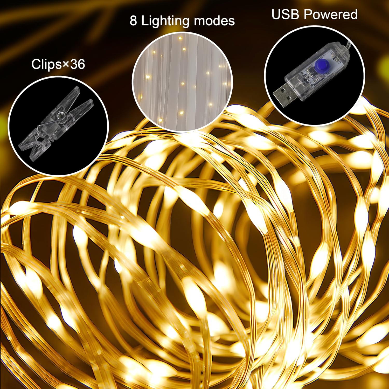 - Package Includes: The package includes 6 panels soft white curtain with lights, each panel tulle backdrop curtain size is 5FT width and 10FT height, a set of 10ft warm white string light (USB Powered) and 12pcs Transparent clips.