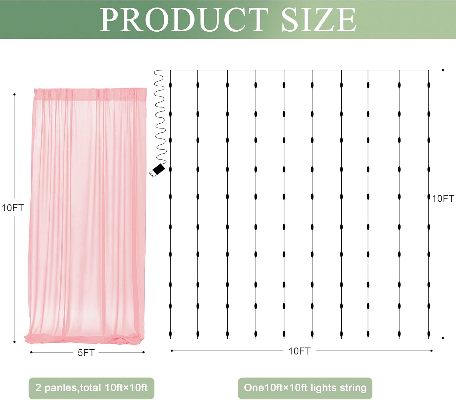 - Package Includes: The package includes 2 panels soft peach curtain with lights, each panel tulle backdrop curtain size is 5FT width and 10FT height, a set of 10ft warm white string light (USB Powered) and 12pcs Transparent clips.