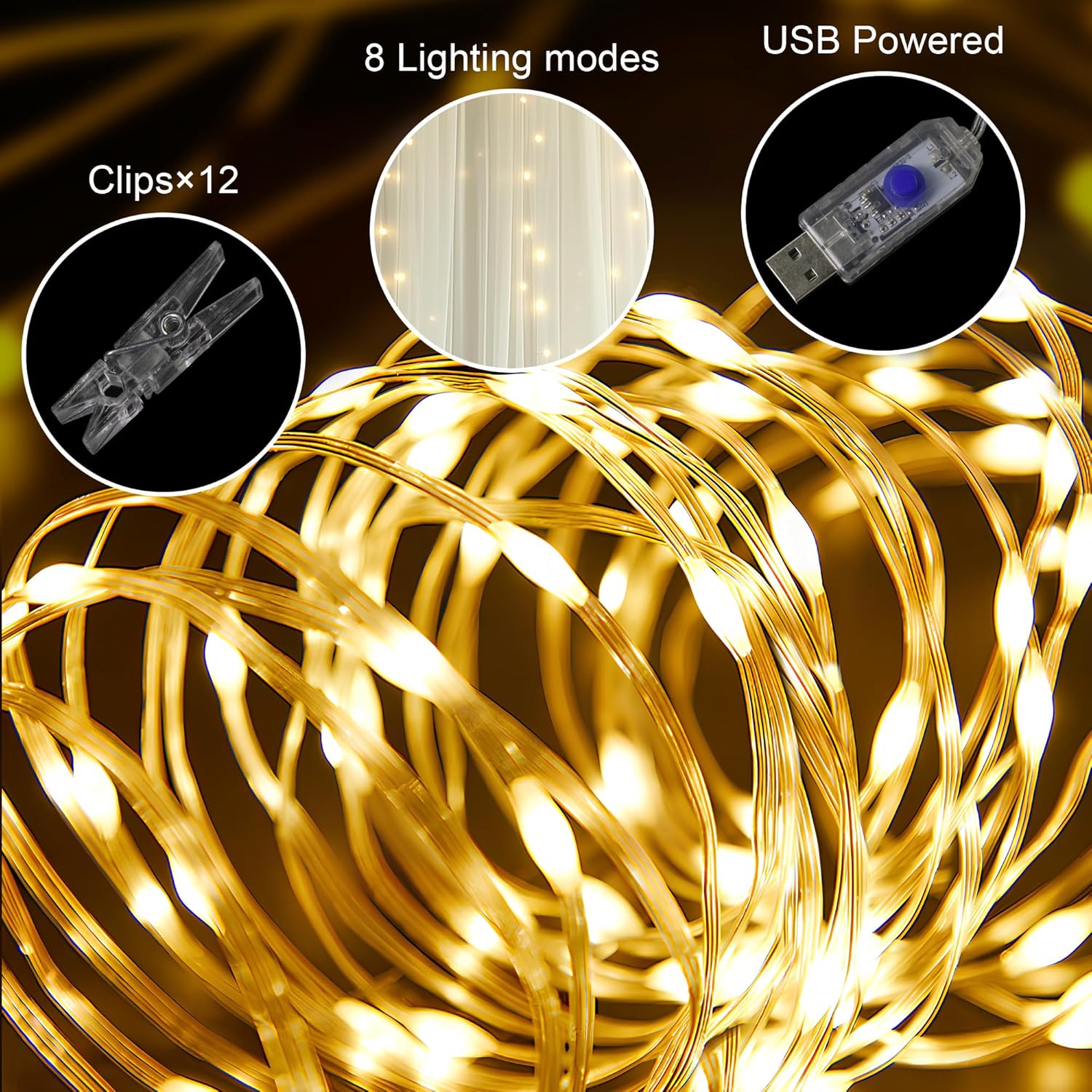 - Package Includes: The package includes 2 panels soft ivory curtain with lights, each panel tulle backdrop curtain size is 5FT width and 8FT height, a set of 10ft warm white string light (USB Powered) and 12pcs Transparent clips.