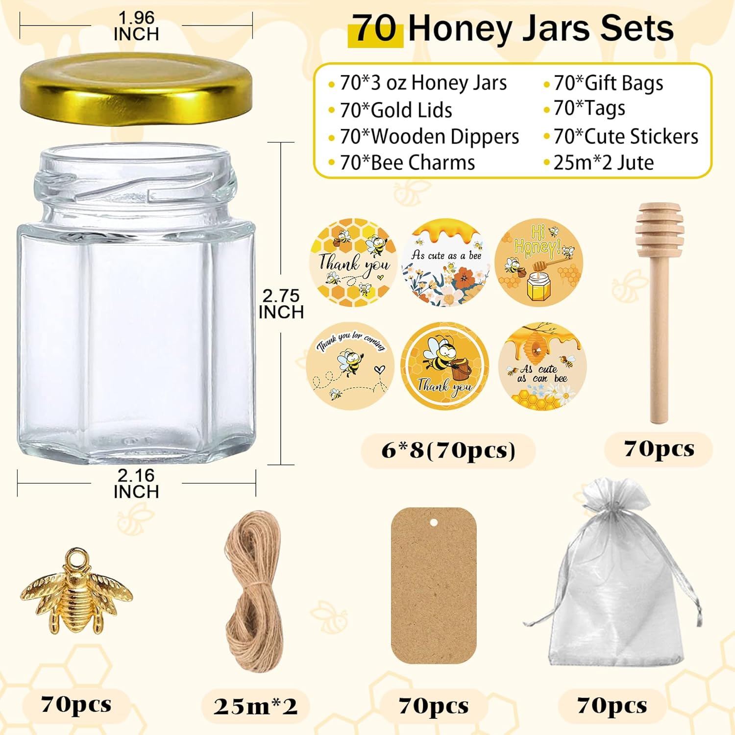 - Great Value Mini Honey Jars Set: This set includes 70 hexagon mini honey jars with dippers, lids, stickers, bee charms, gift bags, tags, and 50m of jute twine. Everything you need to craft thoughtful party favors or sweet handmade gifts with ease.