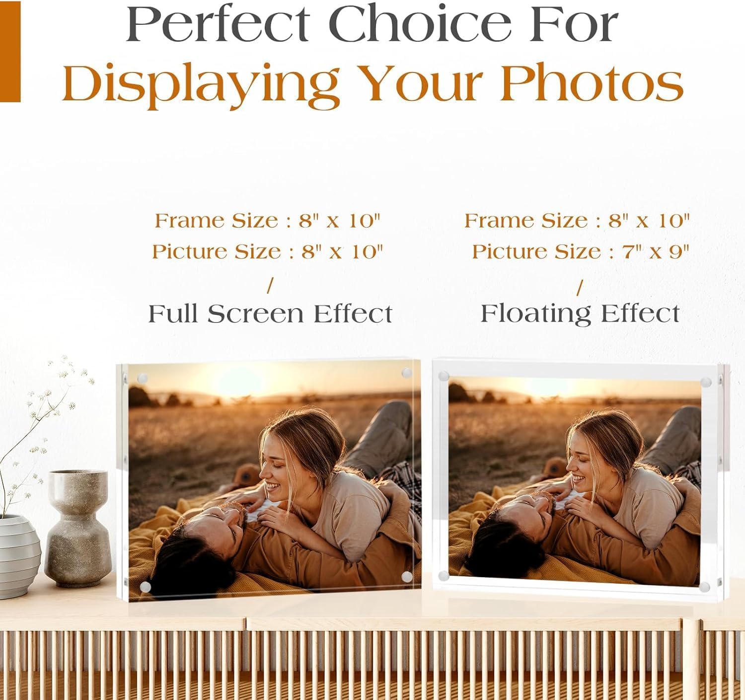 - Versatile and Multi-Purpose: The clear floating acrylic picture frame 8x10 is perfect for various display options. From family photos to artwork, certificates, and even currency, this frame adapts to your needs, making it a must-have addition to your collection