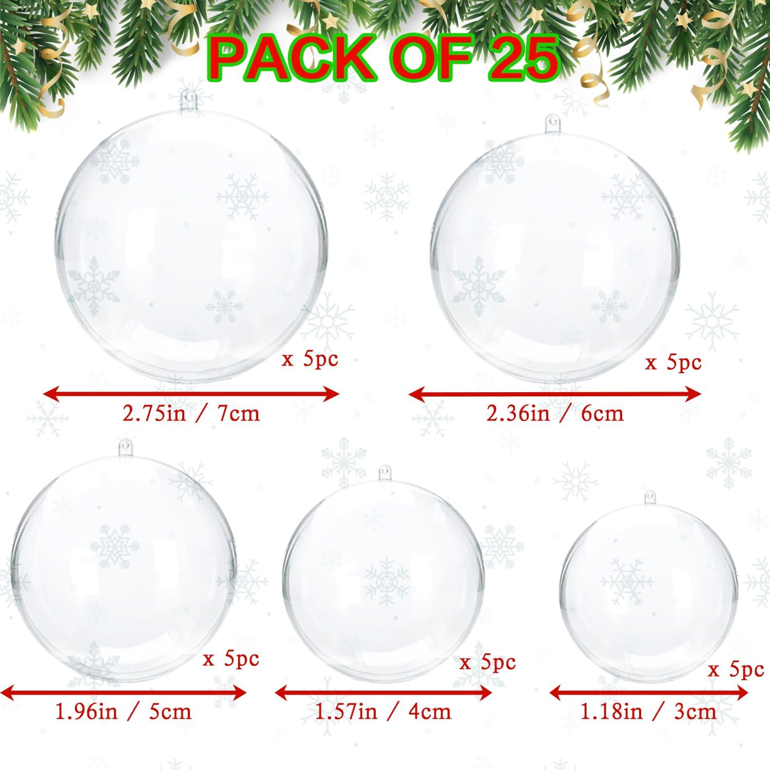 - FILLABLE CHRISTMAS ORNAMENTS BALLS: This set includes 25 pieces clear plastic ornaments in 5 different sizes - 3cm, 4cm, 5cm, 6cm, and 7cm diameter (5 pack of each size).