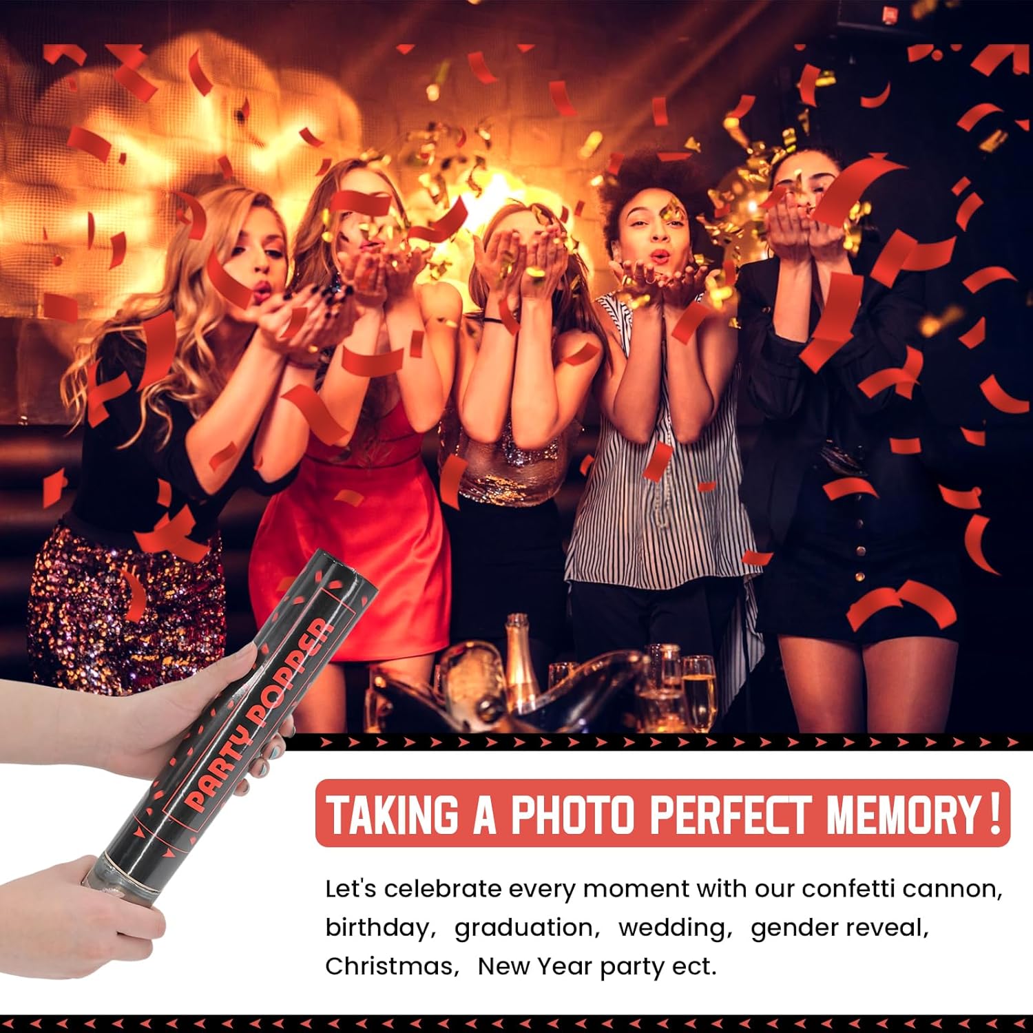 - 12 inch Confetti Poppers Red - Each confetti cannon bulk includes 12 pcs high-quality confetti cannons filled with dazzling red confetti,designed to add excitement and create unforgettable moments.Whether you're celebrating a wedding, birthday, graduation, or any festive event, these confetti poppers will bring the party to life!