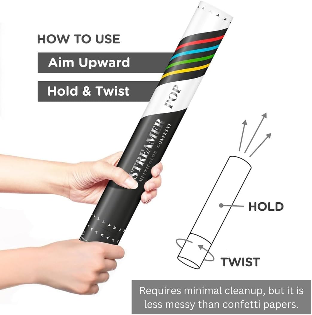 - 🎉 EASY POINT & TWIST ACTION - Don't need the strongest arms to blow up these babies! Point upwards away from people and twist to shoot, confetti paper is loaded on top of compressed air and is launched by twisting the cannon. Operation manual is included inside the box.