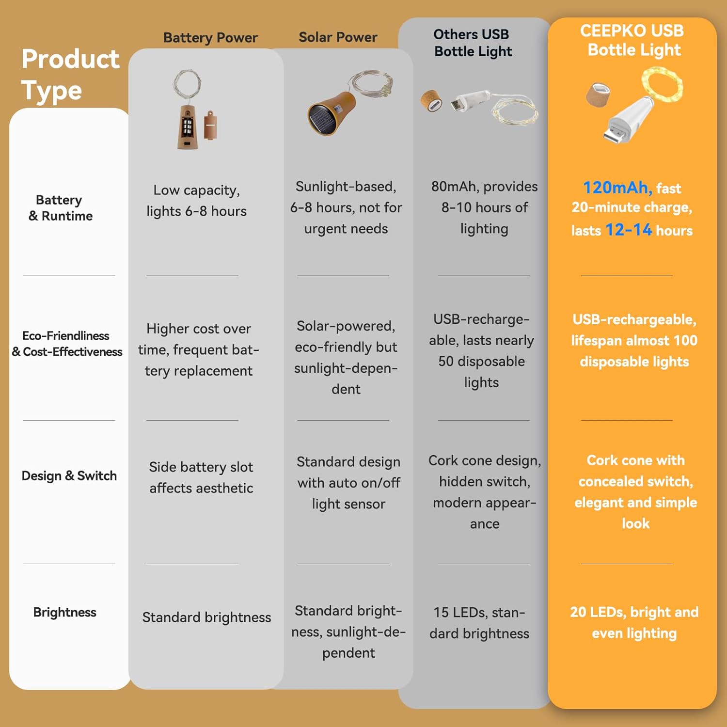 - USB Rechargeable Wine Bottle Lights: No need for disposable batteries; fast USB charging in just 20–30 minutes allows for quick reuse, making it a cost-effective and low-maintenance choice for rechargeable bottle lights