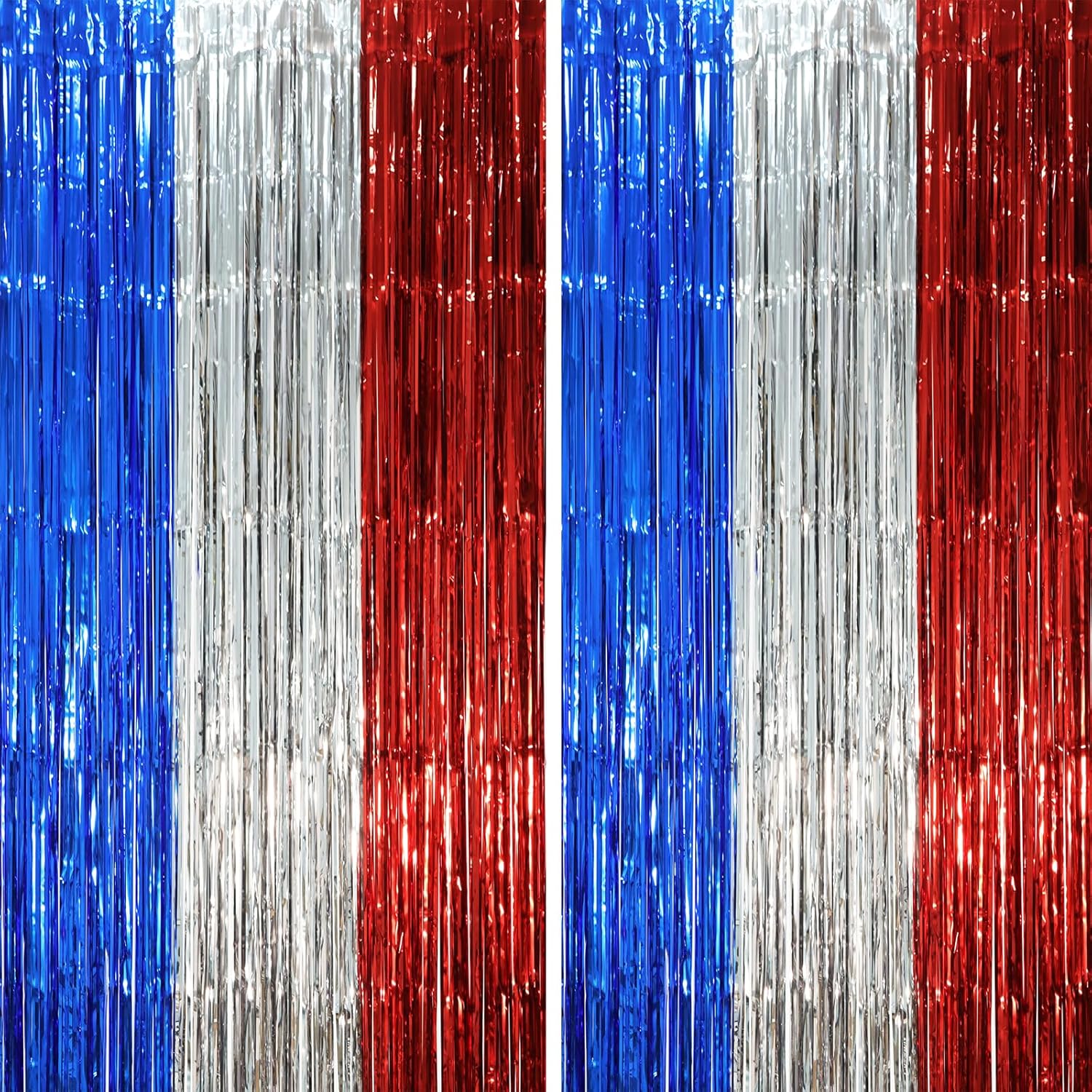 2 Pack Blue Red Silver Foil Fringe Backdrop Curtains, Tinsel Streamers Party Decorations, Fringe Backdrop, Door Shimmer for Independence Day or Birthday Party