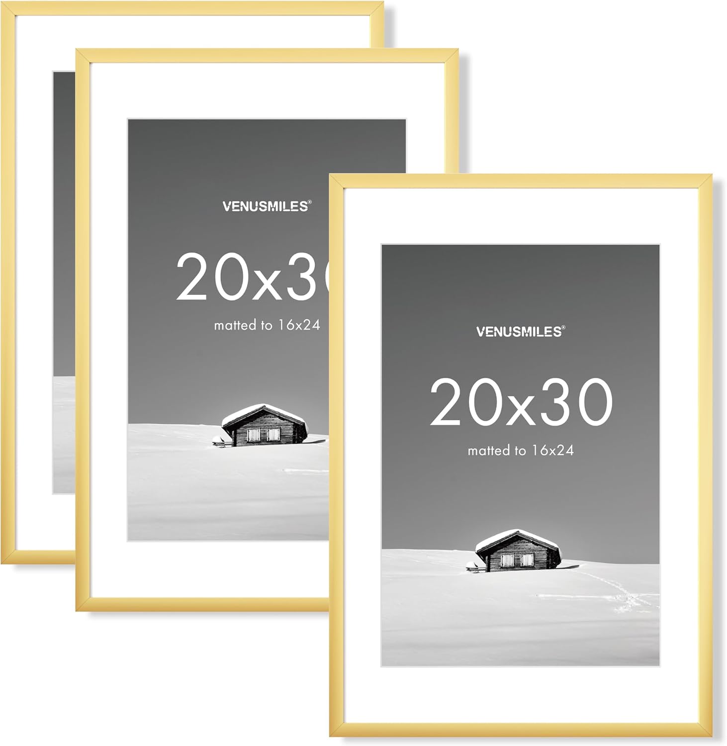 20x30 inch Picture Frame, 20x30 Photo Frames with 16x24 Removable Mat - High Definition Plexiglass - Vertical and Horizontal Display - Wall Hanging Poster Frame - Gold, 3 Pack
