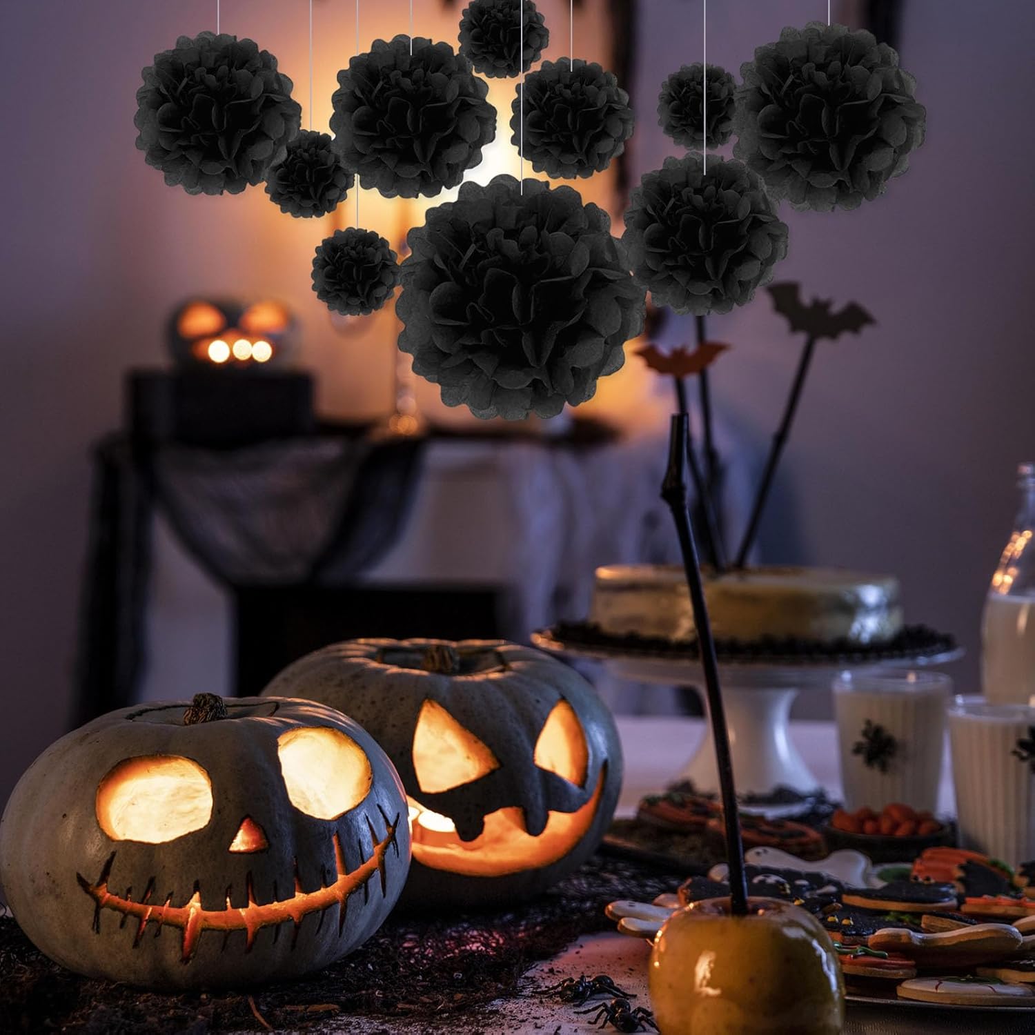 - 【Large Set】20 Pieces black paper flower balls include 6 of 6-inch, 6 of 10-inch, 5 of 12-inch, and 3 of extra-large 14 inch paper pom pom flowers.