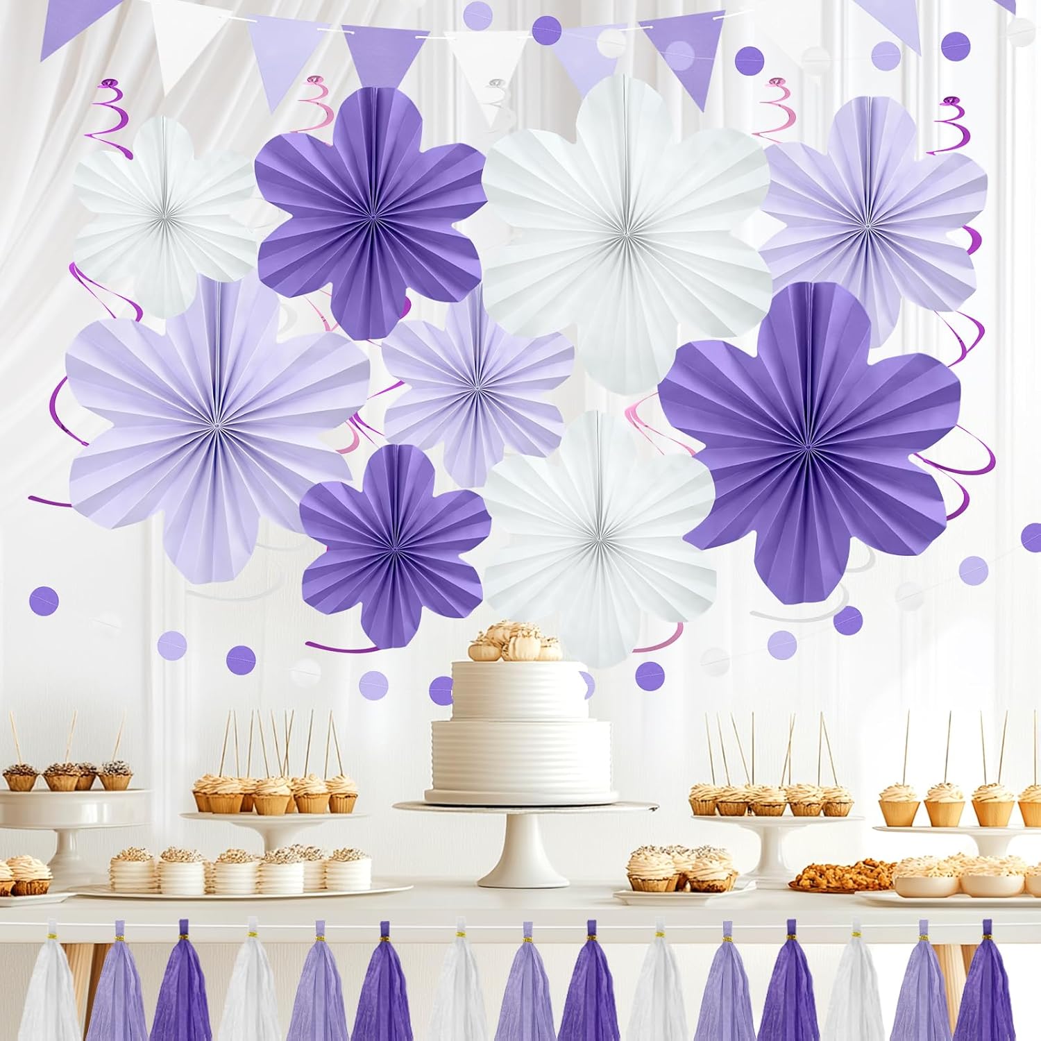 - Lavender Birthday Party Decorations: Our purple and white paper fans decorations kit includes 3 pcs 12’’ paper flowers, 3 pcs 10’’ paper flowers, 3 pcs 8’’ paper flowers, 9 pcs hanging swirls, 1 pcs 6.56ft tasseled garland, 1 pcs 6.56ft triangular pennants, 2 pcs circle dot garland, 2 pcs ribbon.