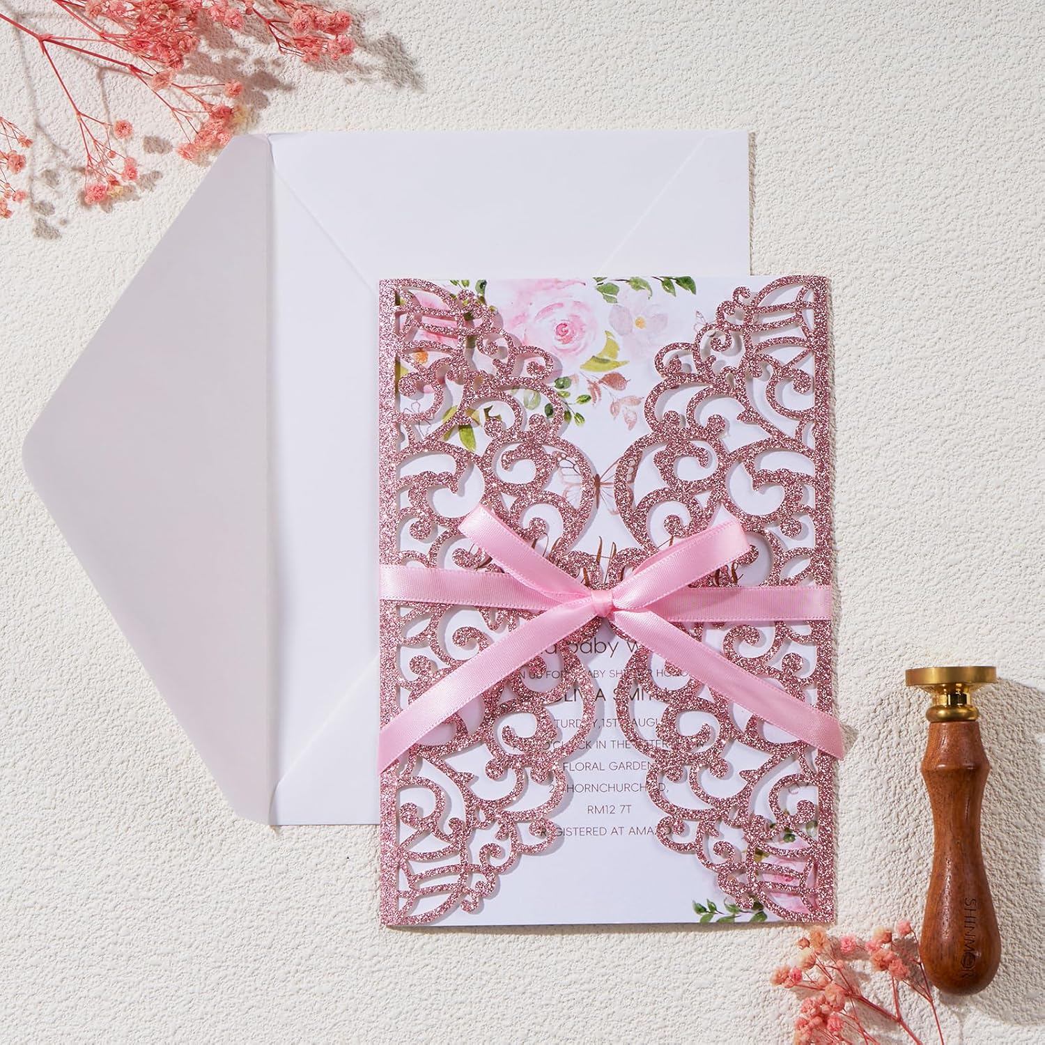 - Luxury Party Invitations: This pink invitation features hollow out floral design, high quality laser cut technology and non-flaking glitter with pink bow ribbon makes the whole invitation exquisite and elegant. Perfect for any important and special occasion!