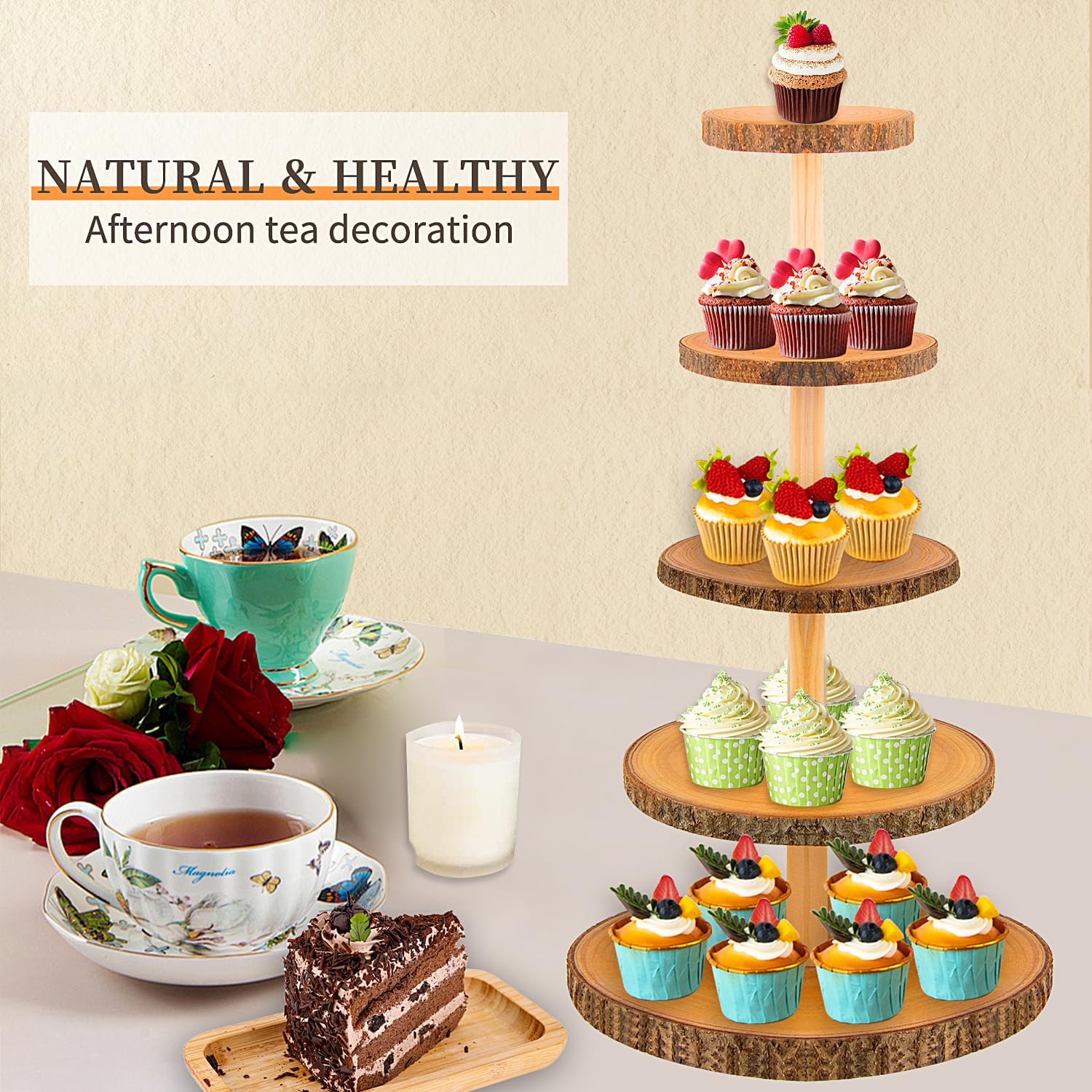 - Elegant Design: This 5-tier cupcake stand features a rustic, farmhouse-inspired wooden design, perfect for displaying desserts, appetizers, or decorative items.