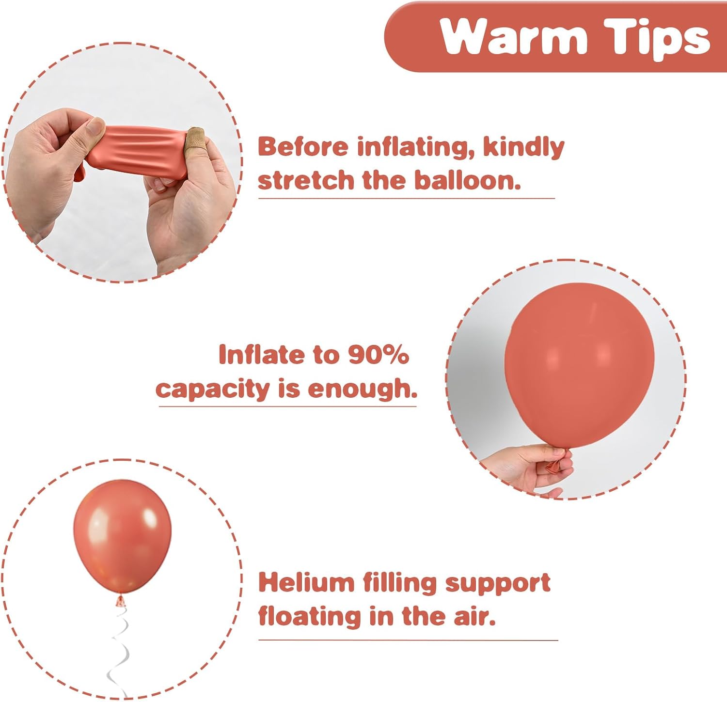 - Friendly Reminders: After inflating, you may notice the balloon colors appear lighter, and lighting can also affect their appearance. To keep them looking their best, avoid sharp objects, rough surfaces, and direct sunlight. Store any unused balloons in a cool, dry place to maintain their quality. If you have any questions, please feel free to reach out!