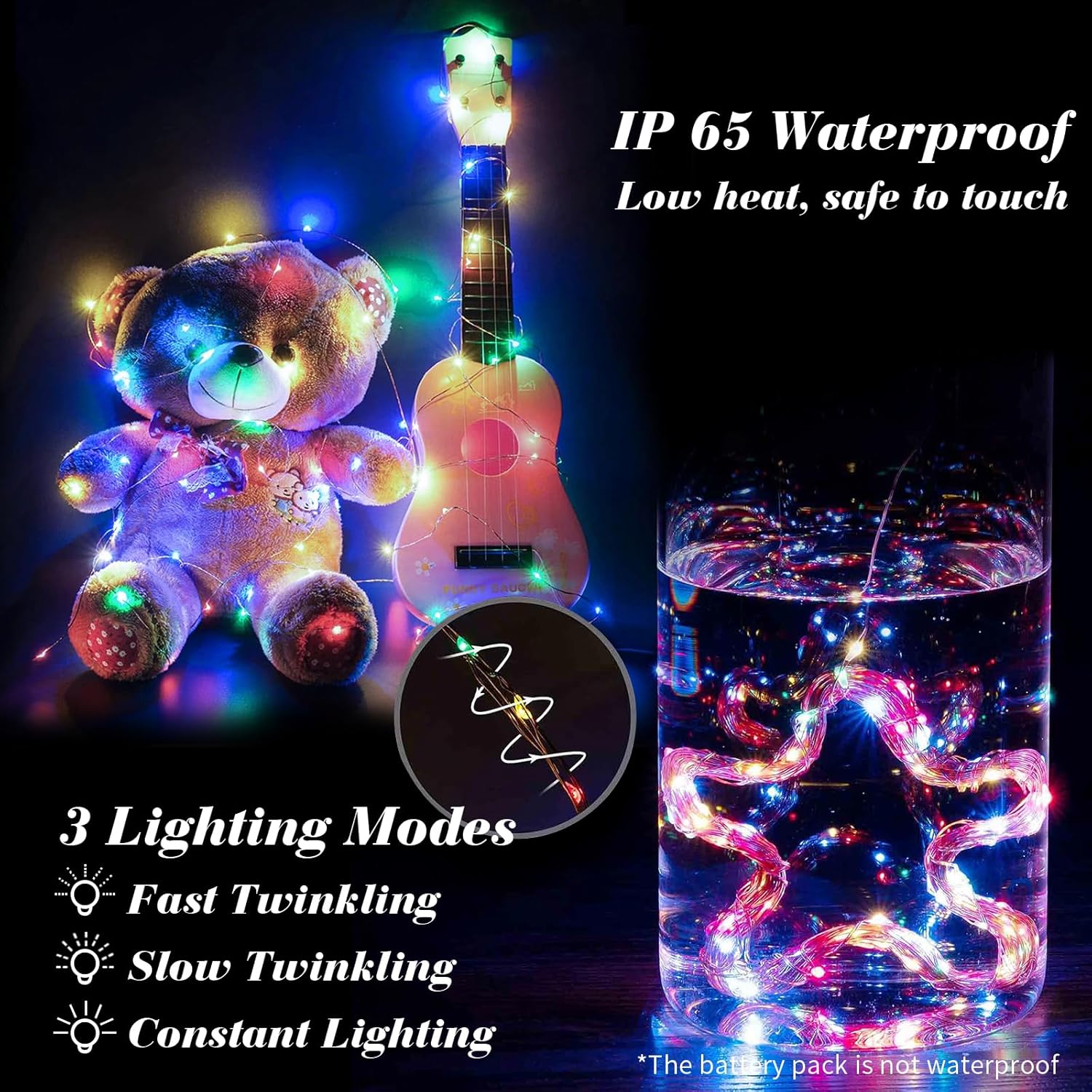 - IP65 WATERPROOF AND INDIVIDUALLY WRAP: The battery fairy lights are waterproof can be used for Indoor/Outdoor. (the battery pack is not waterproof) safe to the touch. Made of soft bendable wire so you can easily bend into any shape or wrapped it on anything such as Christmas trees, wine bottle, pumpkins, guirlande lumineuse interieure, potted landscape etc.Each light is individually packaged, say goodbye to cable tangles and bring more happiness and satisfaction to your family and friends