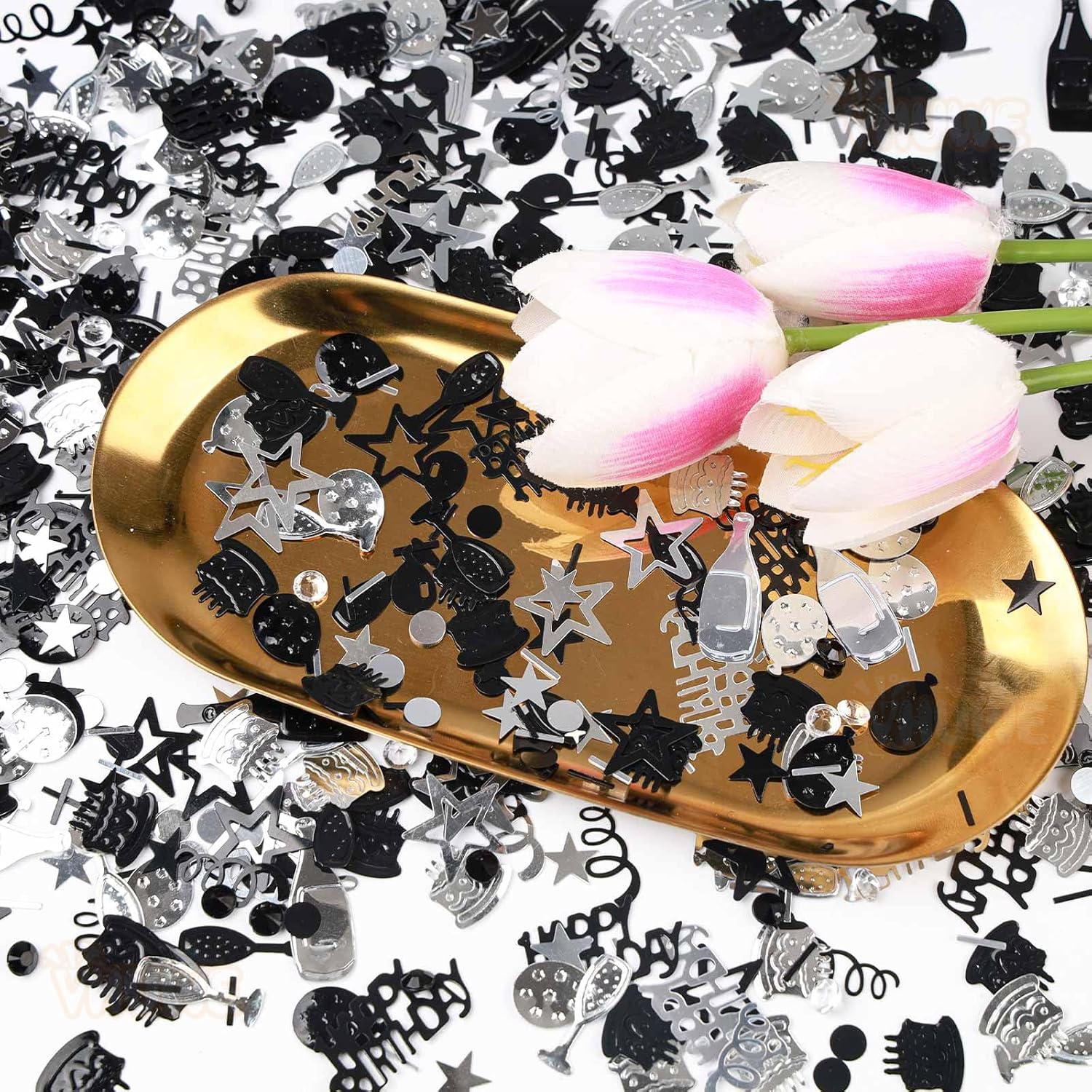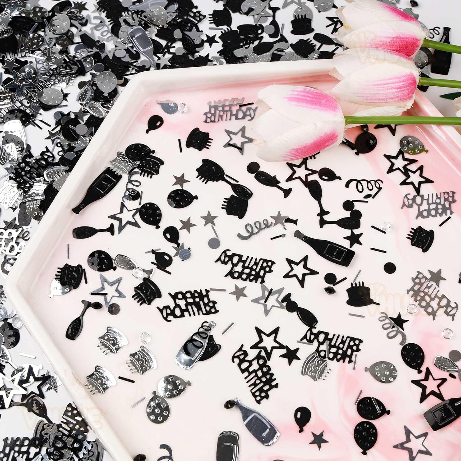 VHUWE Happy Birthday Confetti, 1.6 oz Black Silver Cake Balloon Star Goblet Bottle Confetti for Happy Birthday Party Decorations Boys Girls Kids Women Men Birthday Table Decorations | Black Silver