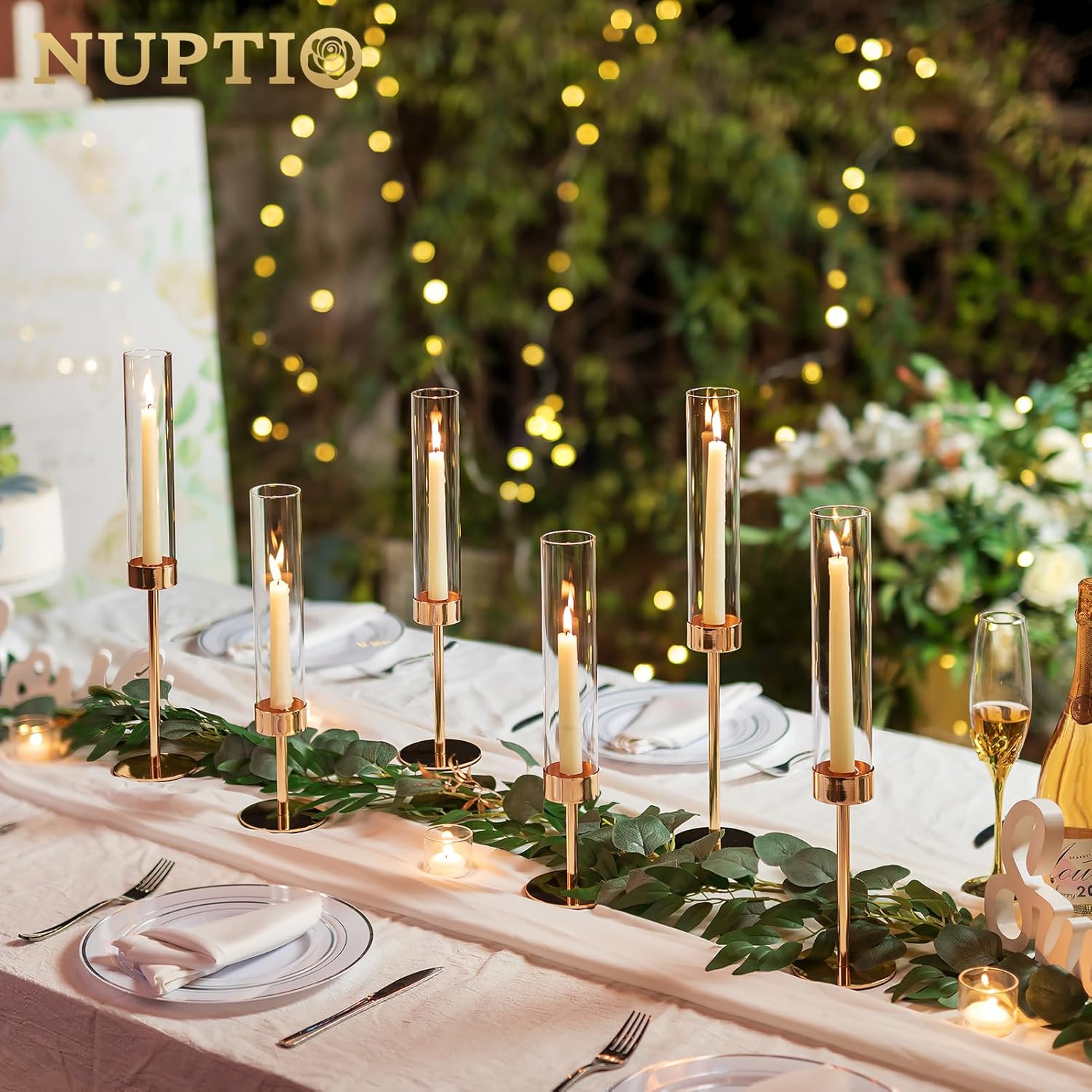 NUPTIO Hurricane Candle Holder for Candlestick: 6 Pcs Gold Taper Candlestick Holders - Tall Modern Candles Stick Decor with Cylinder Shape Cover for Dinner Table Centerpiece