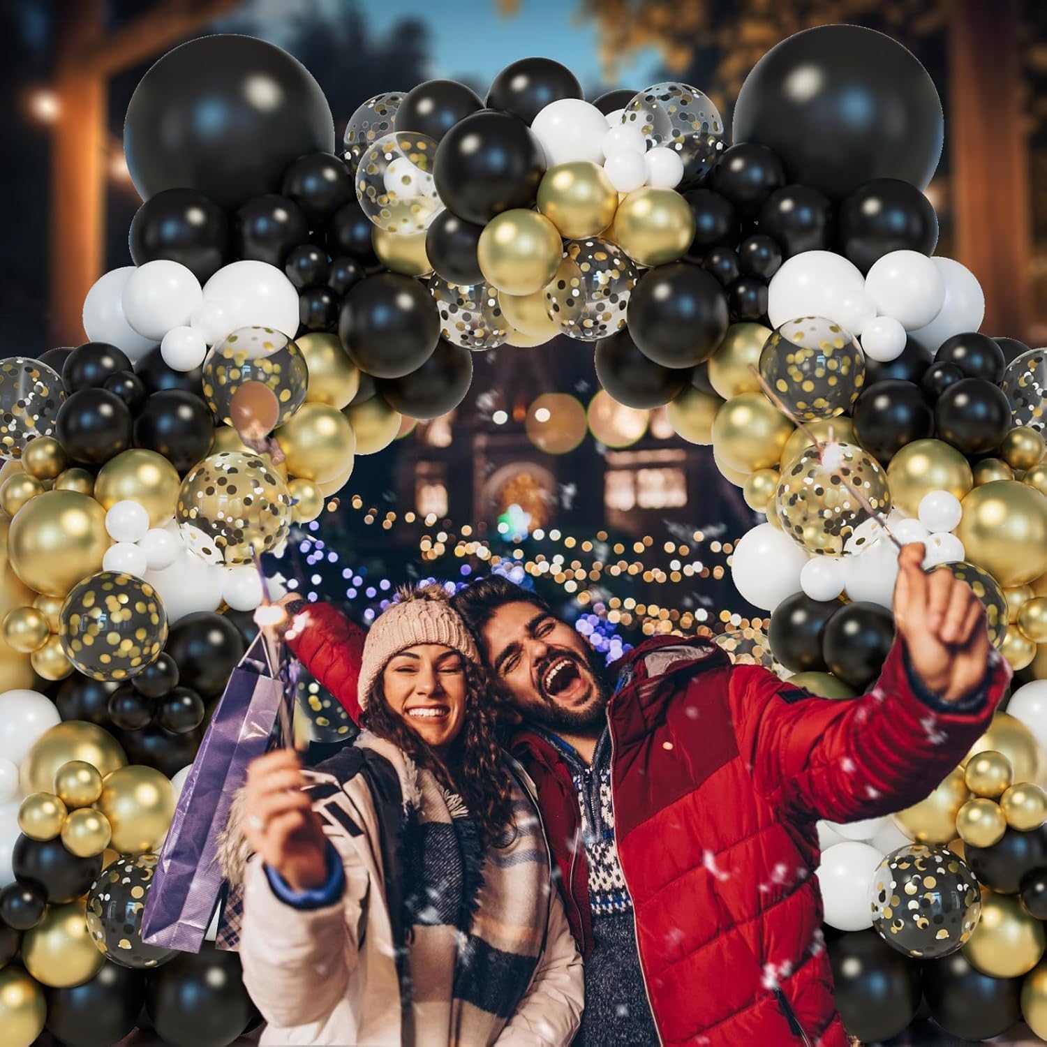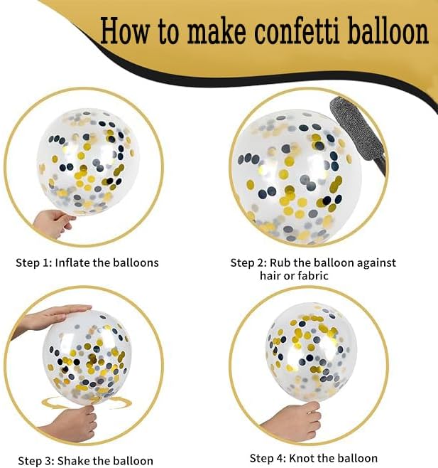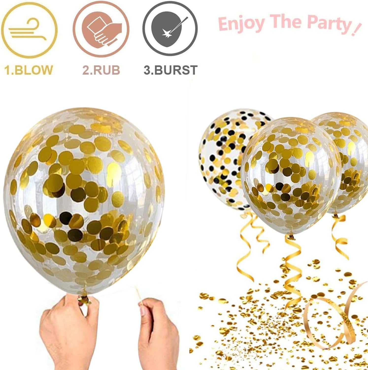 - 【Premium Value Pack】These gold and black balloons set includes:15pcs metallic gold balloons , 25pcs black latex balloons, 15pcs white balloons,5pcs gold confetti balloons,5pcs black and gold mixed confetti balloons,2 rolls of ribbon. All our party balloons are shipped in vacuum packaging to prevent them from being oxidized during transportation.