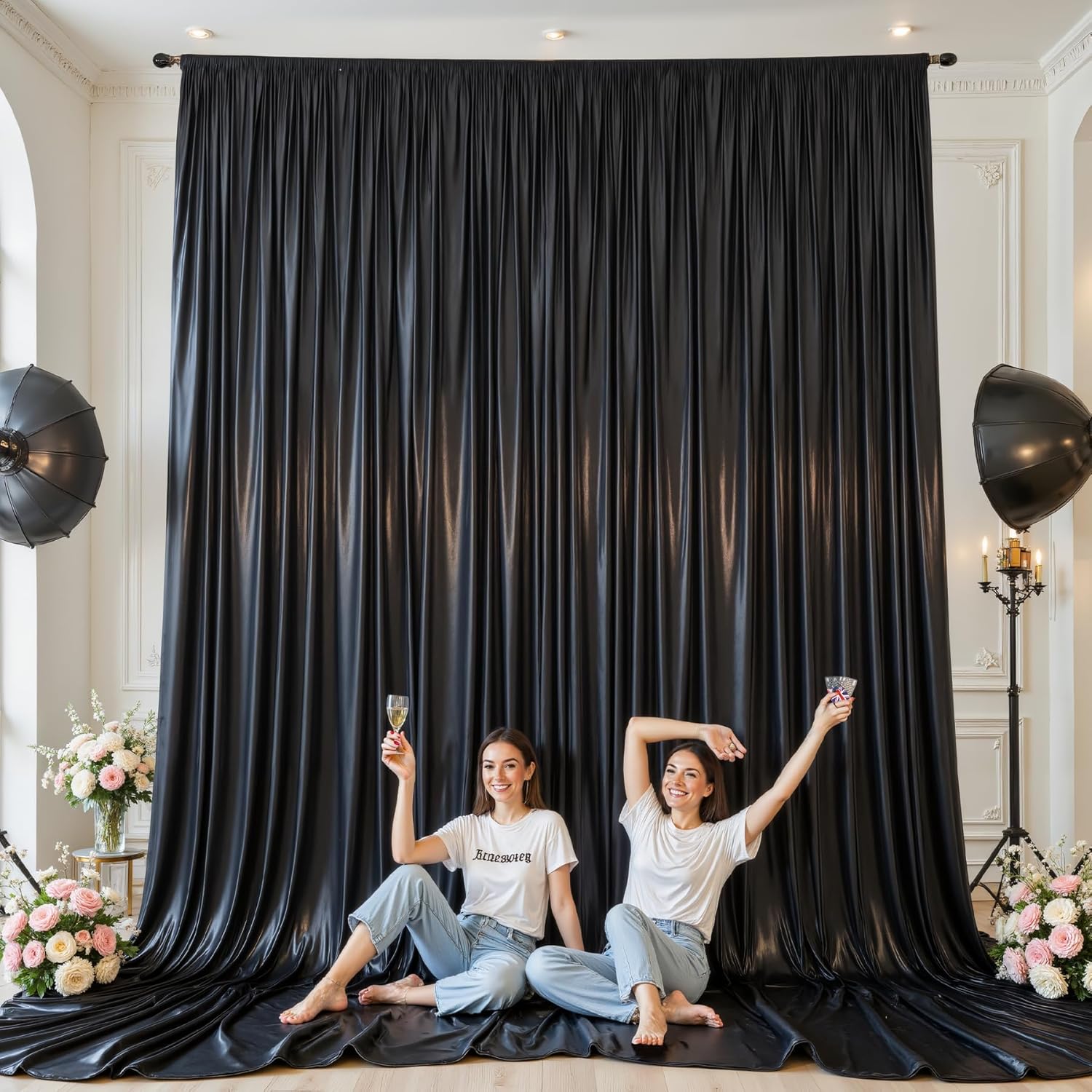 - 【Stunning Black Curtains Material】Our sparkly backdrop curtains panels are super shiny and catch the light beautifully. But the product name there are no actual sequins on these curtain panels, the backdrop drapes is a really soft spandex satin fabric with glitter/sparkles that gives it a nice texture. They are wrinkle free, and nothing will fall off of it. It's a perfect backdrop for any party and they will be able to elevate the look of your decoration.