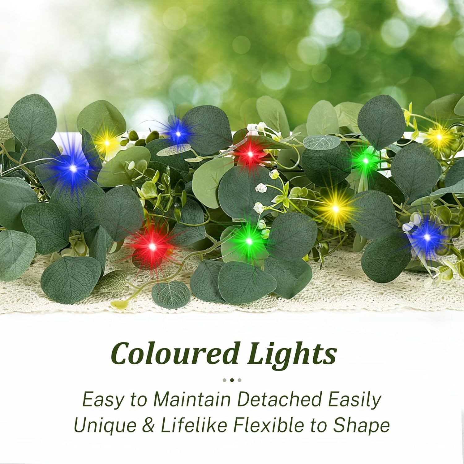 - 【Eucalyptus Garland with Lights】This package with 2 pieces of eucalyptus vines.Each artificial greenery garland is equipped with 20 LED Colored lights, providing a gentle glow to enhance your home's ambiance. These lights are powered by 2 AA batteries (not included)