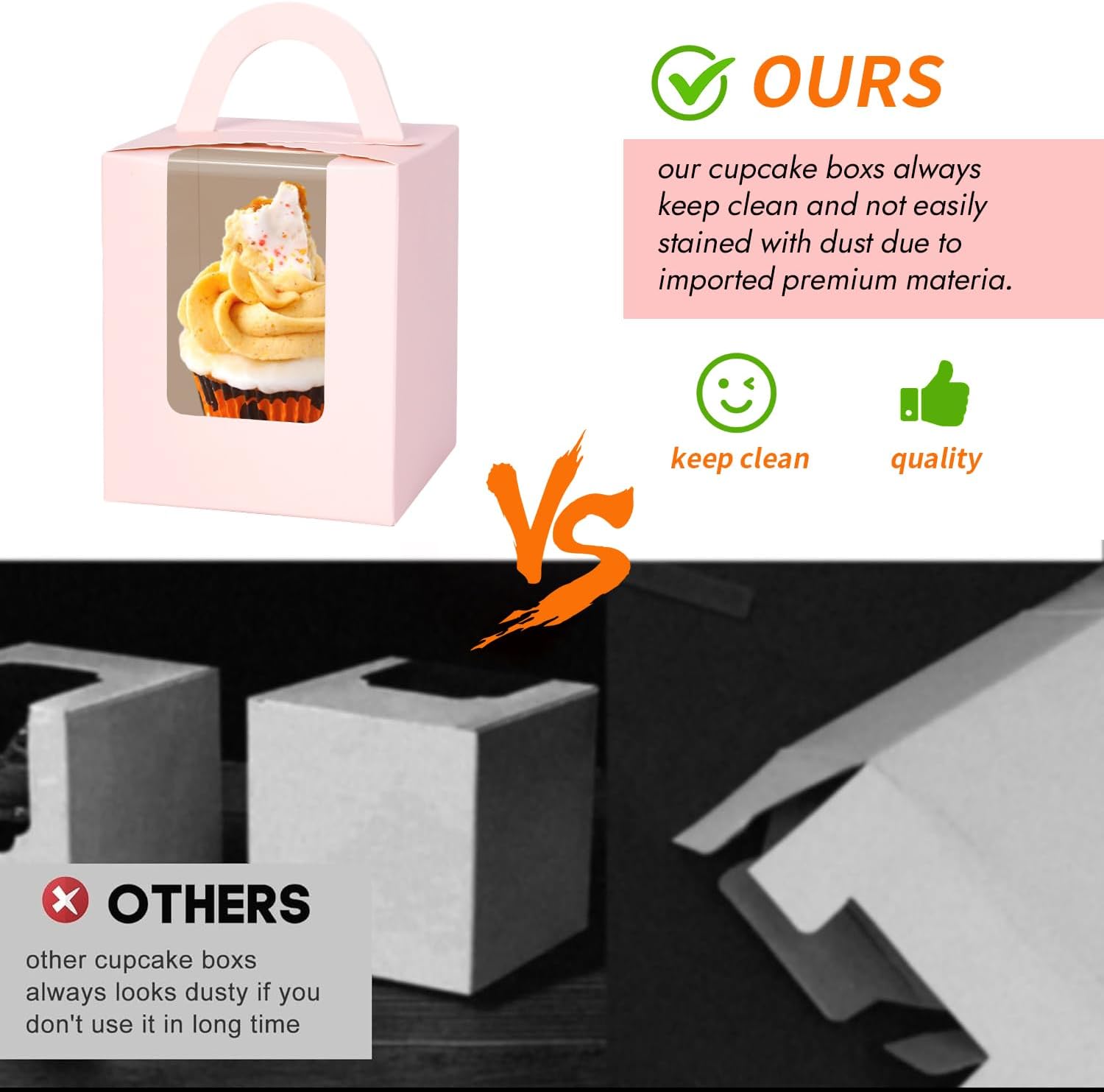- High Quality:We adopt superior raw material only,and our box quality through the food safty quality text(FDA).These cupcake boxes are made of food grade quality cardboard paper eco-friendly, reliable and sturdy enough to prevent deformation. These boxes can be used as treat boxes/ cookie boxes/ gift boxes.Most of the paperboard after printing that you will find inferior Material will give a unhealthy smell, and it will fade after quick friction,Especially pink and black.