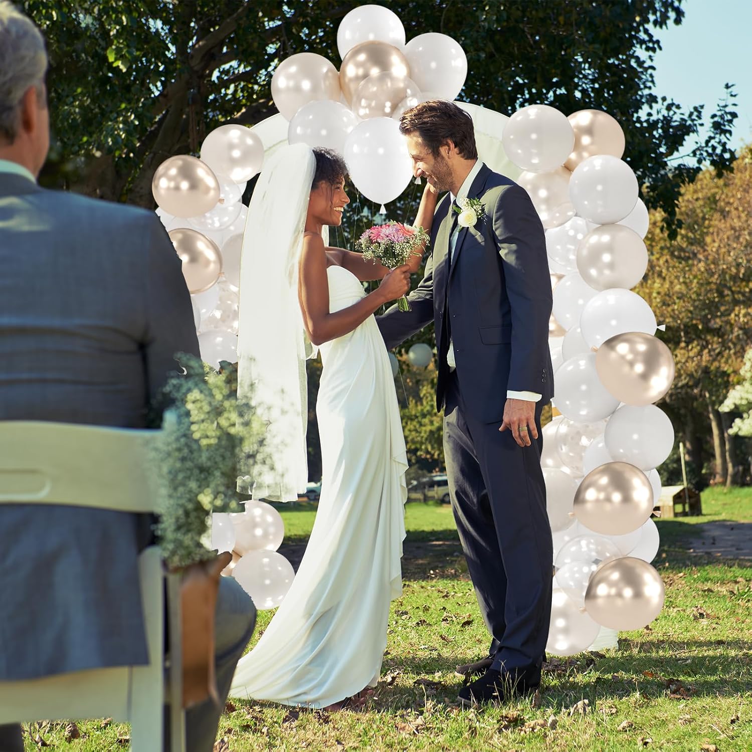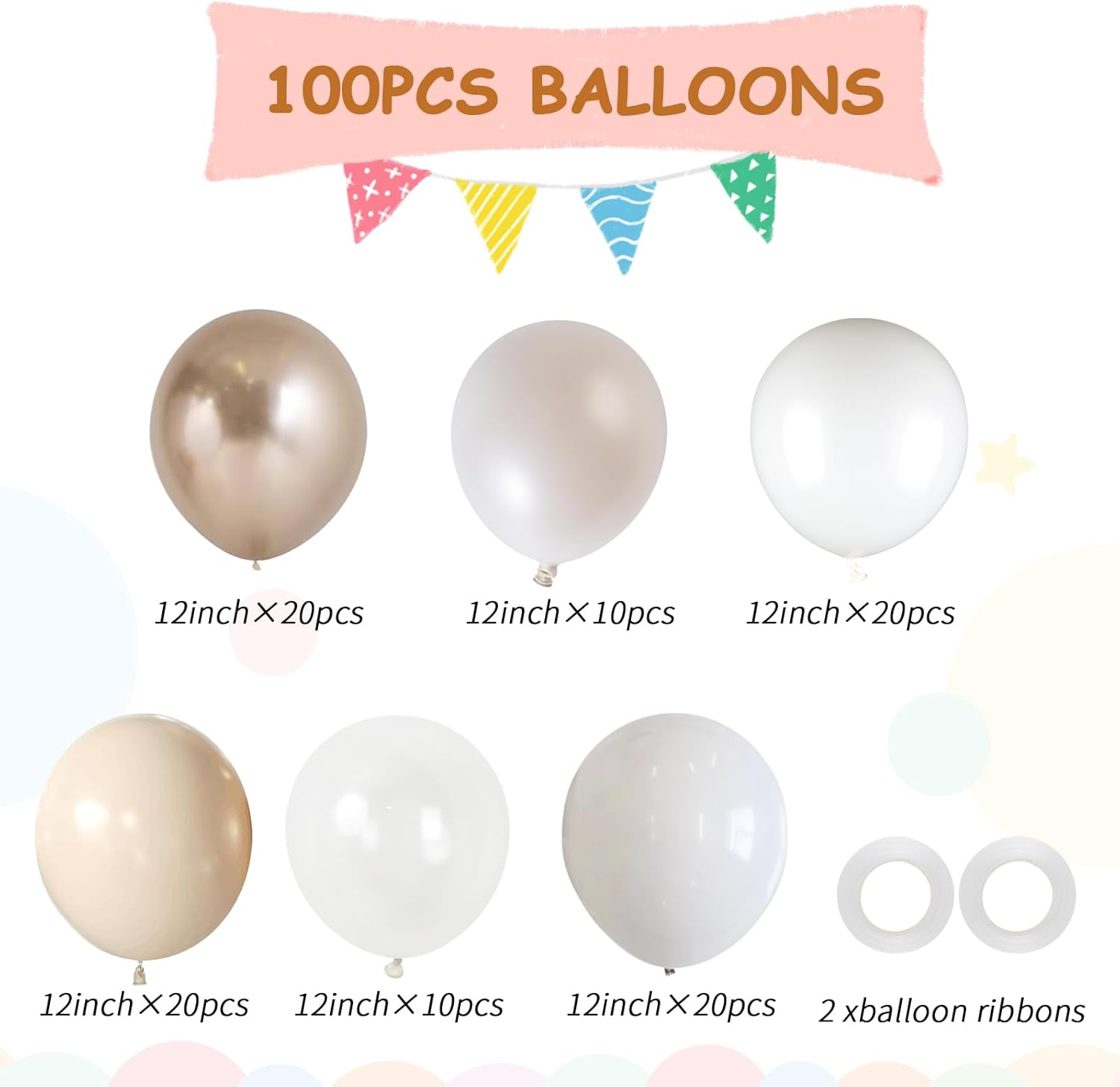 - Elegant Neutral Balloons : Come with 100pcs party balloons, Includes 20 metallic champagne gold balloons, 20 sand white balloon, 20 white balloons, 20 nude balloons, 10 pearl white balloons, 10 clear balloons, 2 balloon ribbons. All the balloon size is 12 inches after inflation.