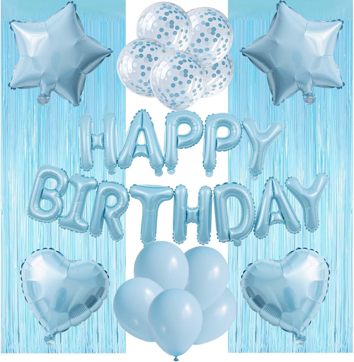 - Happy Birthday Balloon Kit: 13pcs 18inch aluminum foil happy birthday letters, 2 pack light blue foil fringe curtains, 2pcs 18inch pentagram star balloons, 2pcs 18inch heart balloons, 5pcs 12inch blue confetti balloons, 5pcs 12inch baby blue balloons