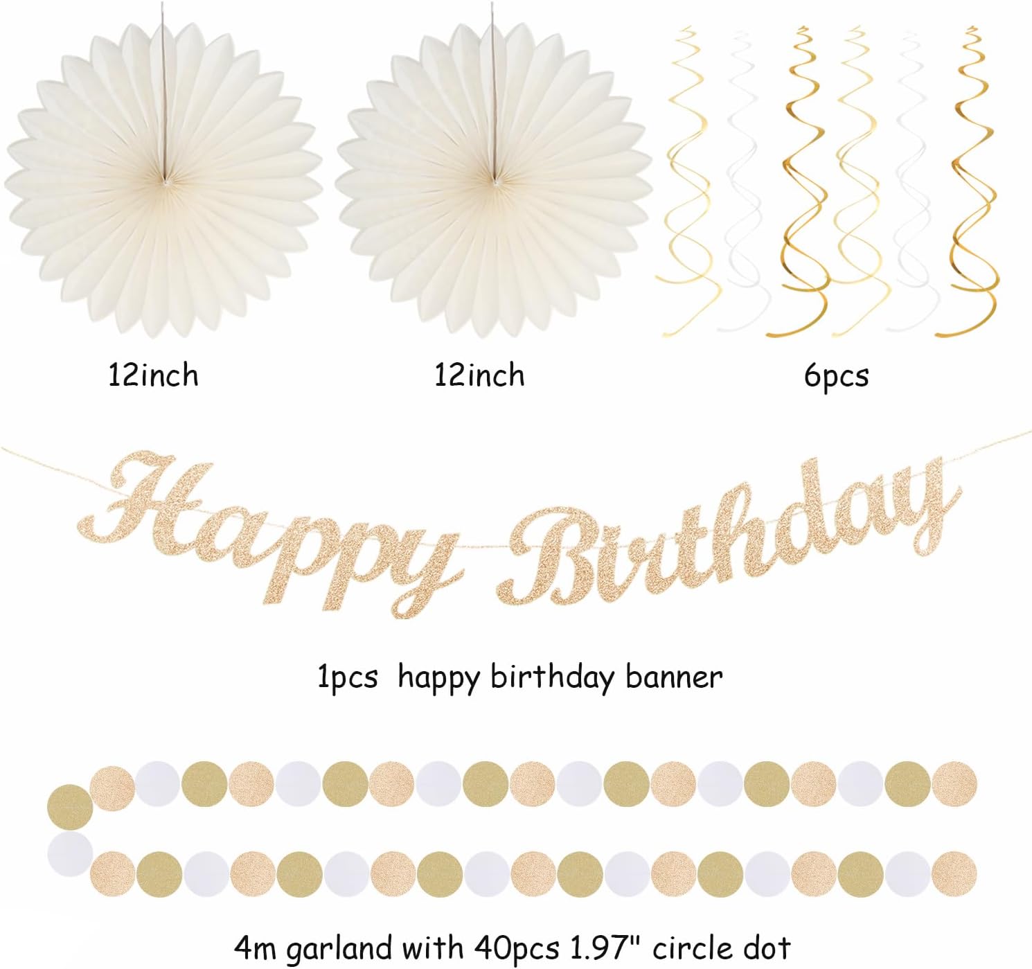 - Package Includes: This kits include 1pcs rose gold happy birthday banner, 1pcs circle dots paper banner, 10pcs tissue pom poms, 2pcs paper lanterns, 2pcs paper flower fans, 6pcs paper swirls hanging streamers in champagne beige and peach colors, and different sizes