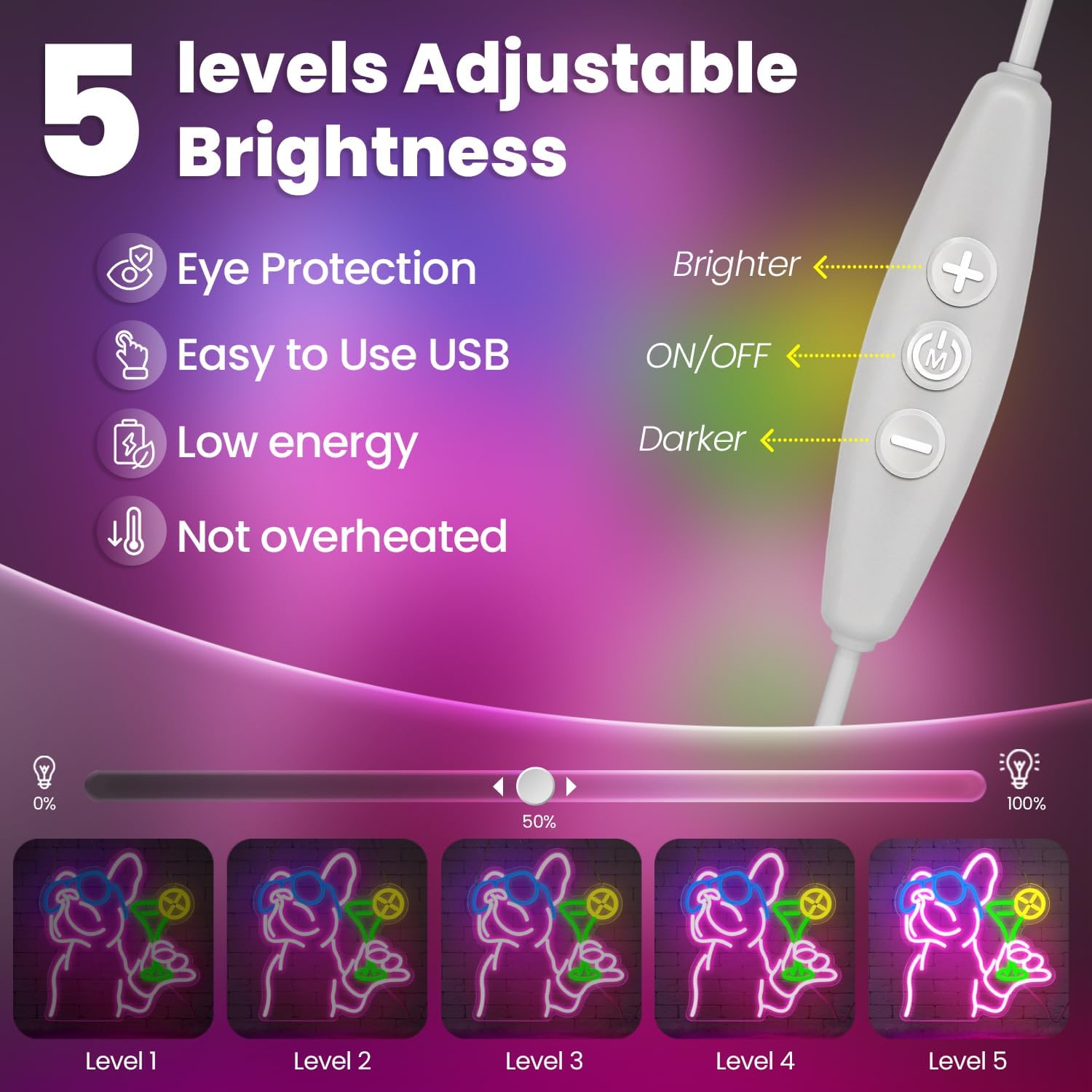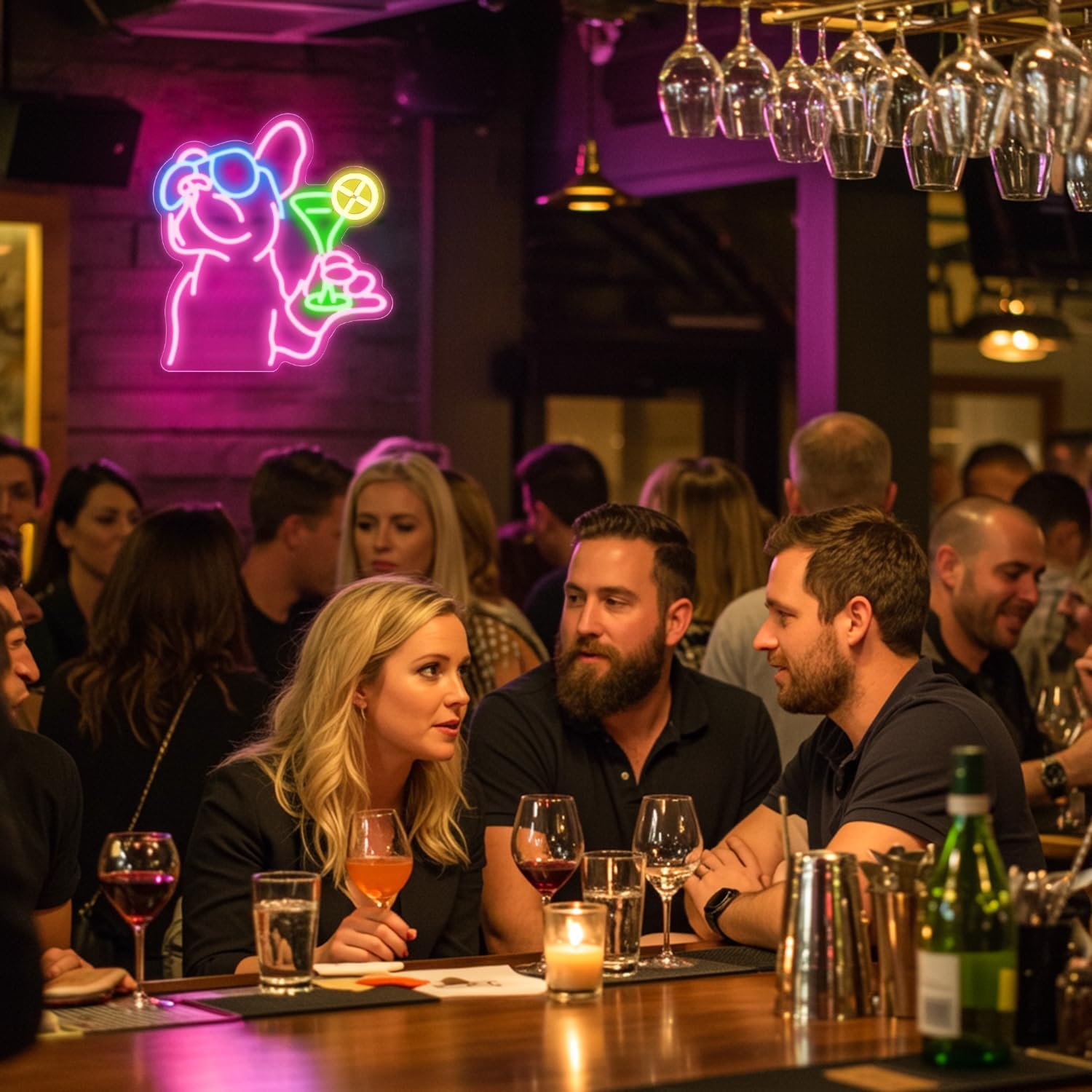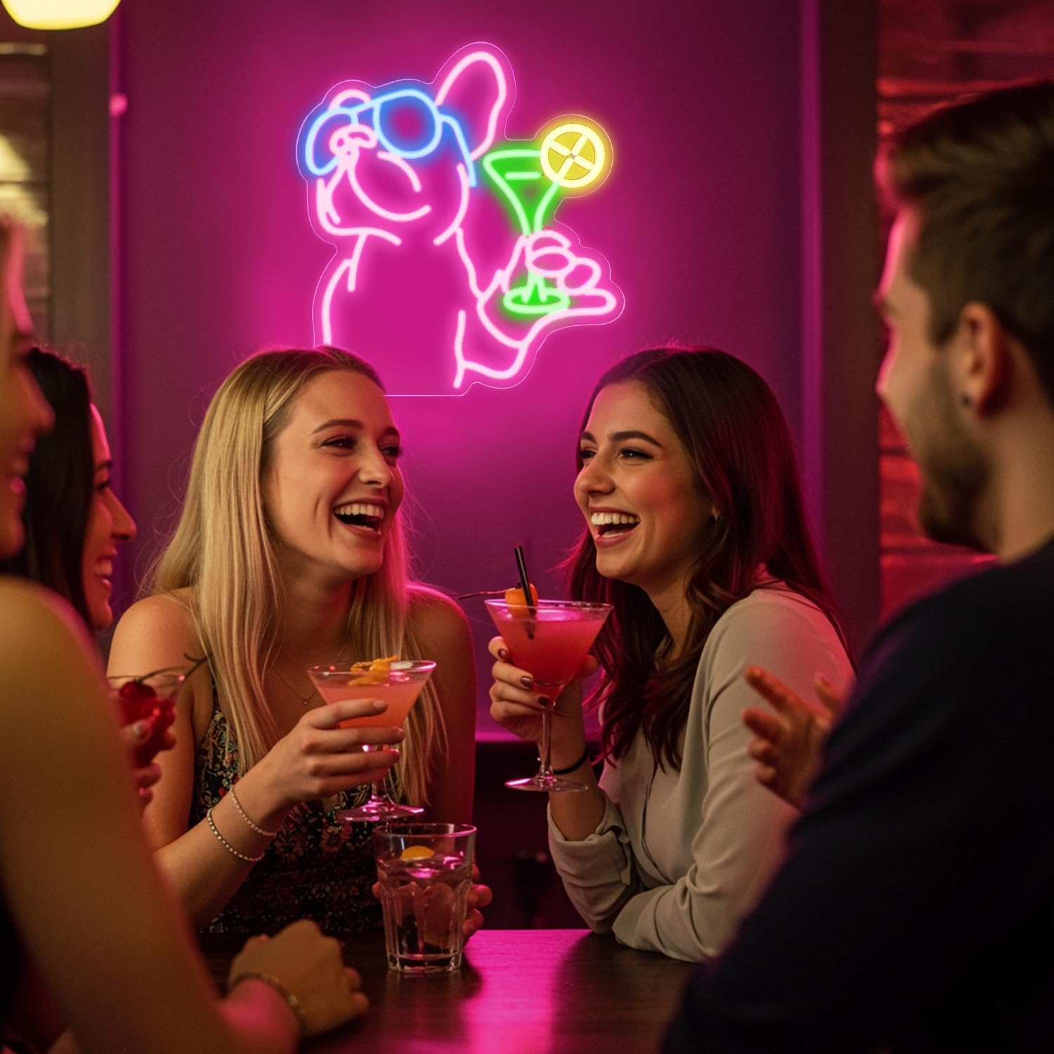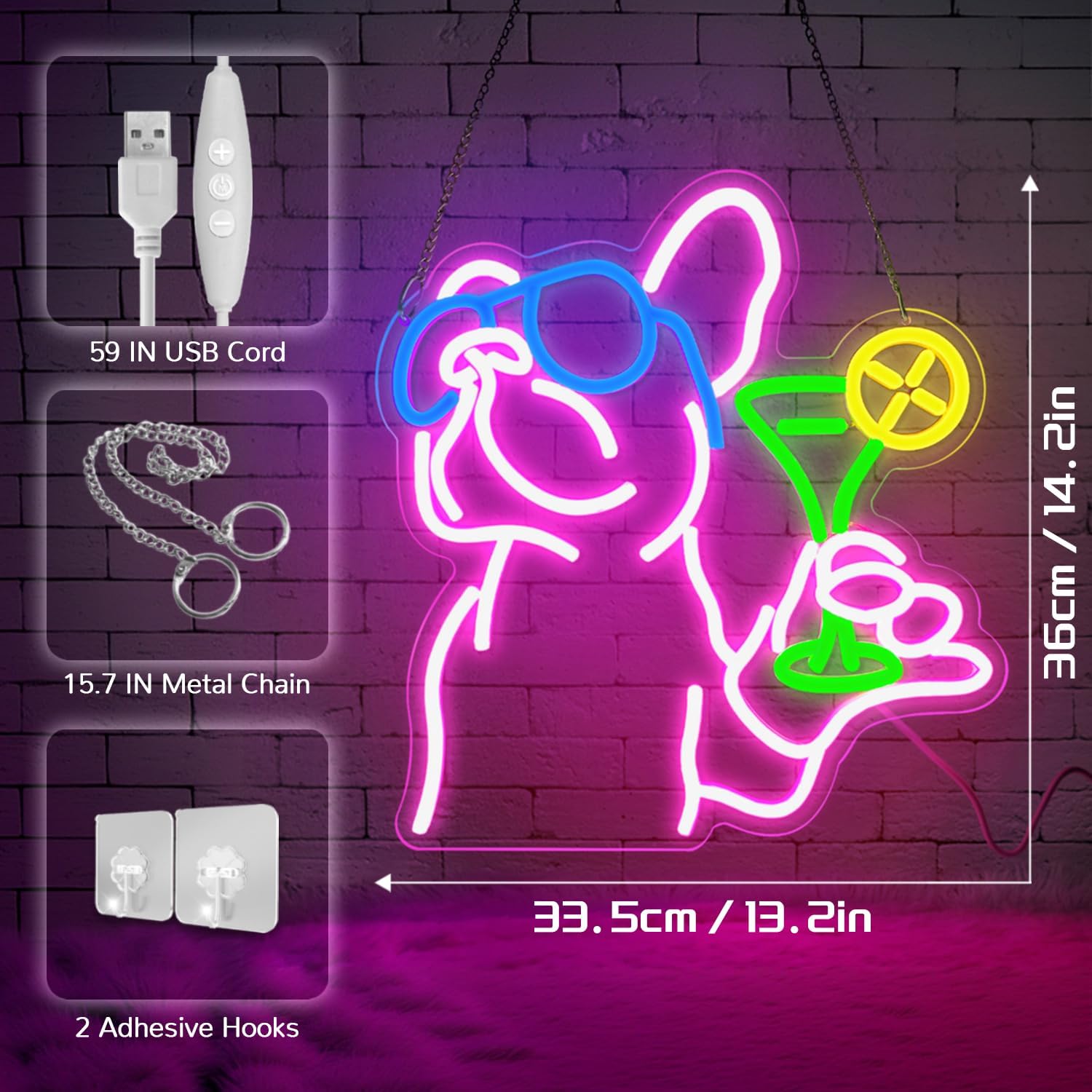- Cool French Bulldog Design Features a funky French Bulldog wearing sunglasses and holding a cocktail—perfect neon wall art for adding personality to your space.