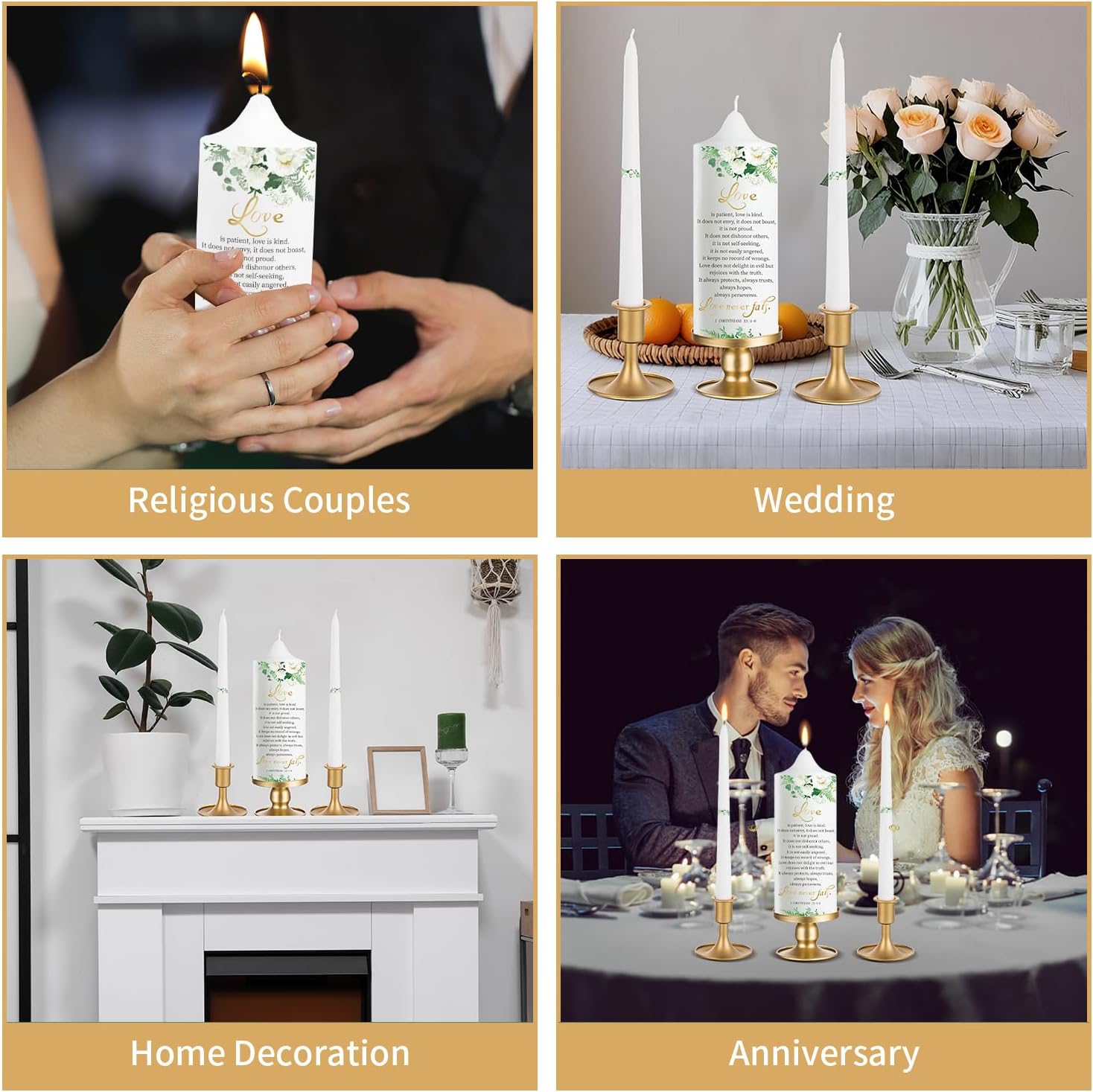 - 🕯️ Complete Unity Wedding Candle Bible Verse Set – This elegant unity candles for wedding ceremony set includes one large 8" pillar candle, two 10" taper candles and 3 gold candlestick holder, beautifully crafted for your most sacred moment.