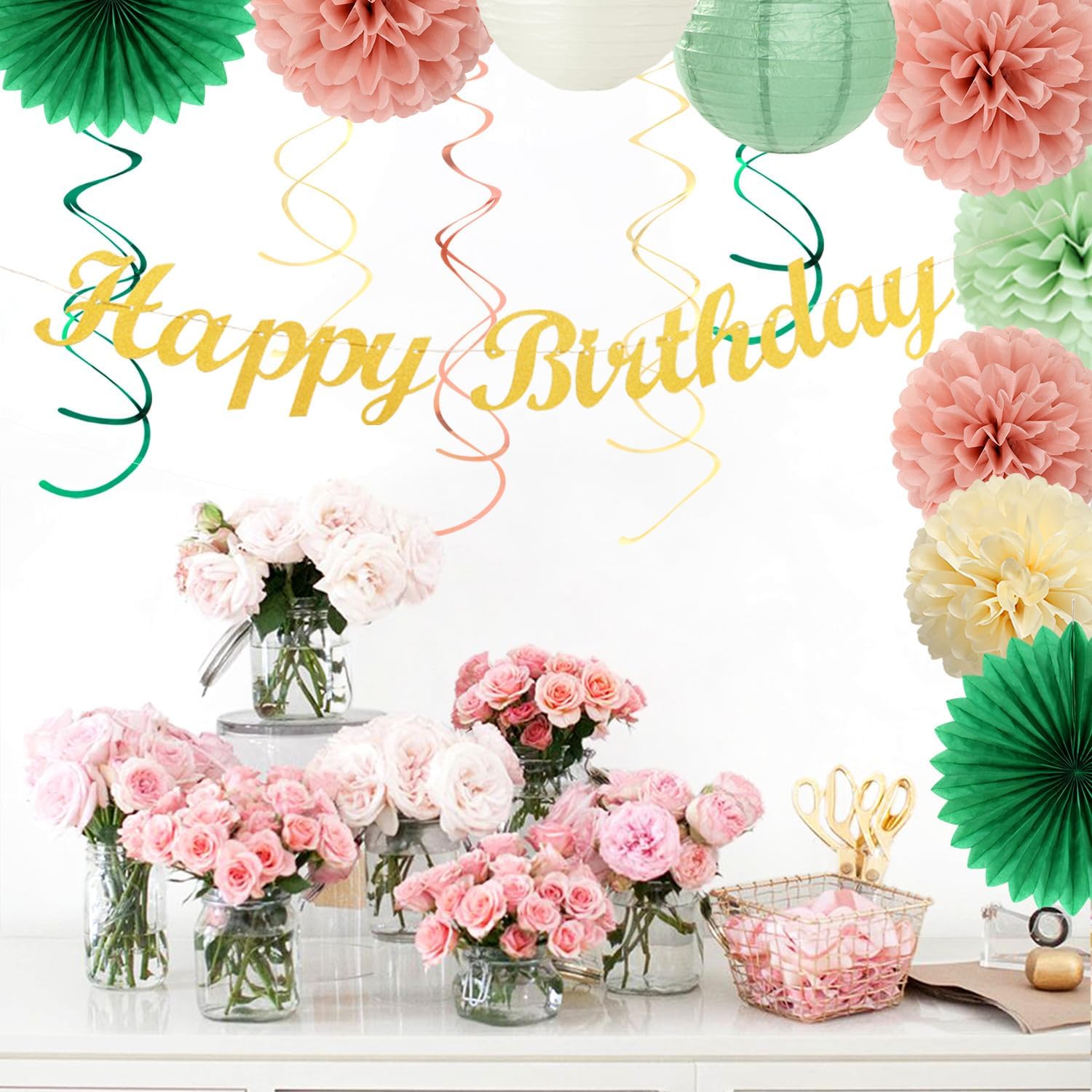 - Package Includes: This kits include 1pcs gold happy birthday banner, 1pcs circle dots paper banner, paper tassels party garland, 4pcs tissue pom poms, 2pcs paper lanterns, 2pcs paper flower fans, 6pcs paper swirls hanging streamers in olive sage dark green and beige colors, and different sizes