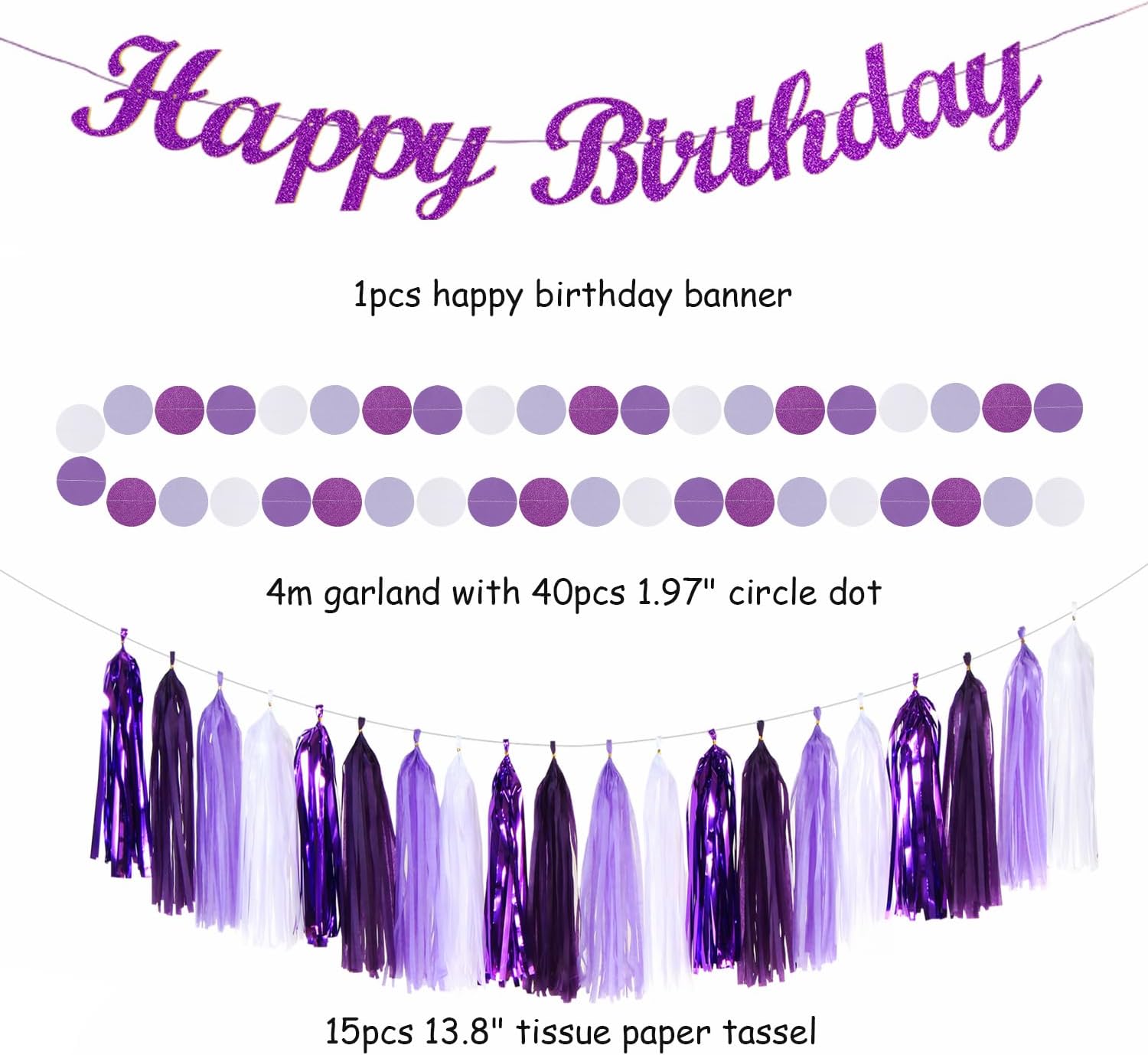 - Package Includes: This kits include 1pcs purple happy birthday banner, 1pcs circle dots paper banner, paper tassels party garland, 4pcs tissue pom poms, 2pcs paper lanterns, 2pcs paper flower fans, 6pcs paper swirls hanging streamers in purple white lavender and lilac colors, and different sizes