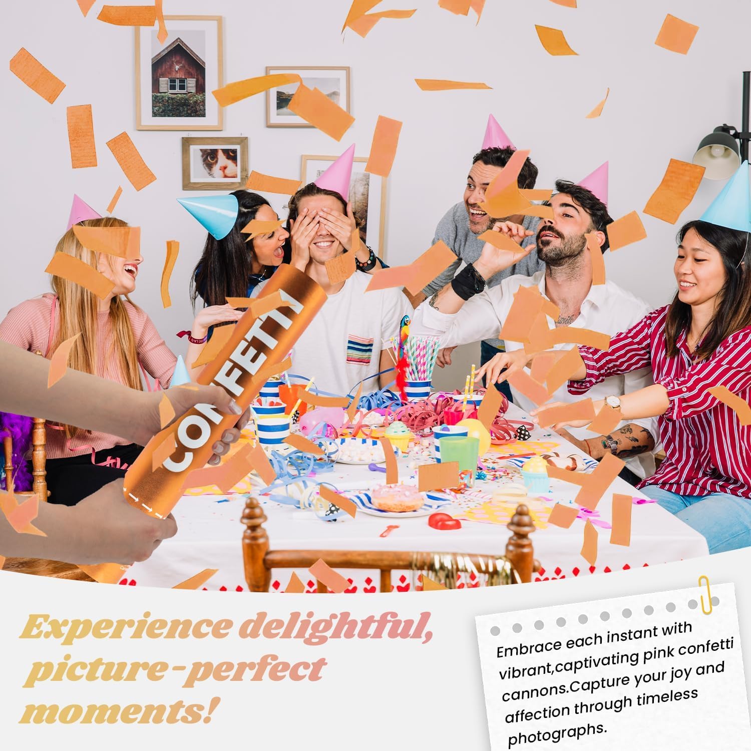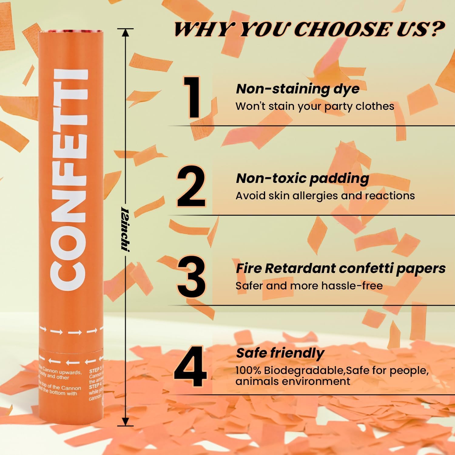 - 【Safe & Easy to Use】Our Orange biodegradablel confetti cannon kit contains Orange paper confetti are friendly, non-toxic. Biodegradable party poppers confetti shooters work well indoors and outdoors easy to clean and 100% safety, you and your guests can enjoy confetti cannon for your celebrations party.Just give each confetti cannon a hard twist and let the magic happen!