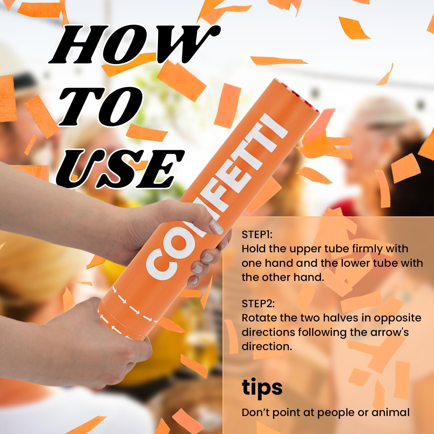 - 【Good Quality Party Poppers Cannon】12inch confetti poppers are full of high quality Orange biodegradable confetti, air powered party poppers can shoot 10 to 15 feet in the air like a Orange butterfly launch your celebration unforgettable memories! Everyone likes popping poppers! Twist the bottom of the party poppers and watch the confetti blasters out on you and your loved ones and get a photoshoots.