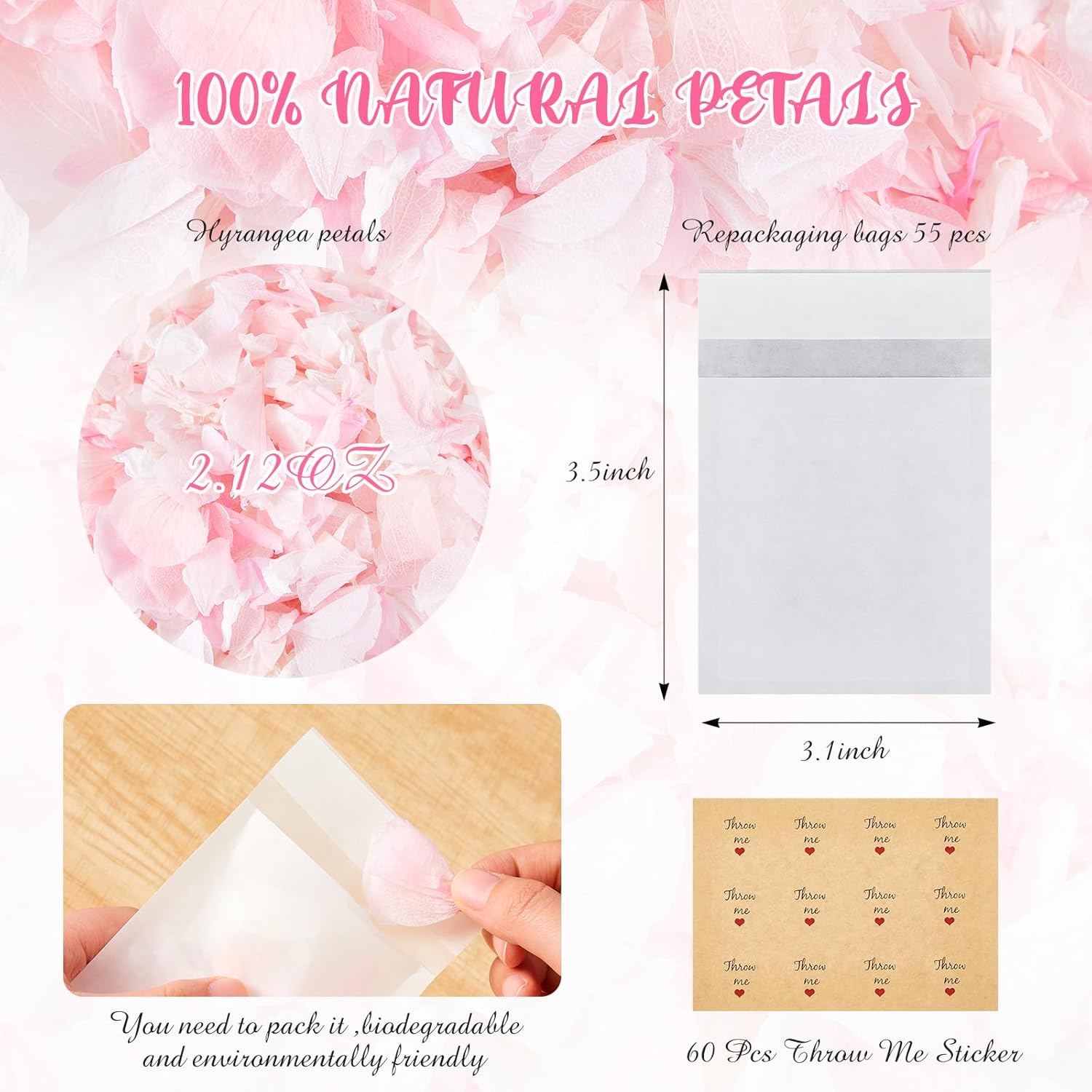 Biodegradable Confetti, Dried Hydrangea Flower Petals with Throw Me Stickers Wedding Confetti Biodegradable Flower Petals for Wedding Ideas Valentines Day Decor(Pink White,55 Pcs)