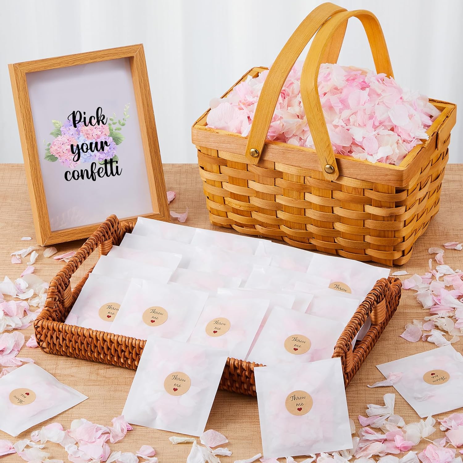 - Wedding Dried Flower Petals: Wedding decorations kits have 80g flower petal cones, 60 pcs throw me sticker, 55 pcs biodegradable packaging bags, they look lifelike and can be preserved like dried flowers which meet your wedding needs, and leave a beautiful memory