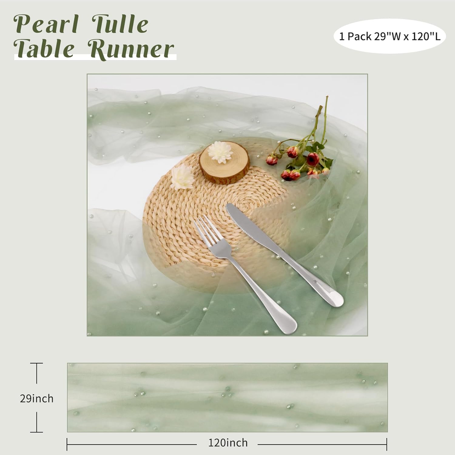 Pearl Table Runner 29 x 120 Inch Tulle Fabric Lace Table Runners Boho Rustic Tablecloth for Bridal Shower Birthday Party Wedding Arch Aisle Veil Dessert Table Decor(1 Pack, Sage Green)