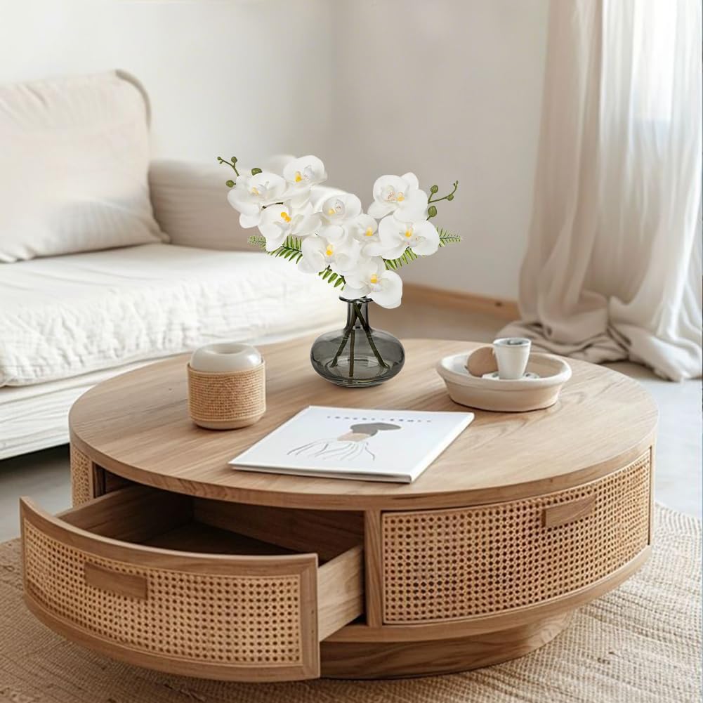 - Artificial Orchids with Vase - This white orchids for centerpieces has 8 eye-catching bloomed white orchid flowers, with lifelike orchid branche, leaves and buds, are displayed in a black glass vase perfectly, which wrapped in hand-woven jute twine , it enhance the taste of home decoration.This white orchids arrangements is an ideal gift for your lovers/family/friends on Mother's Day, Anniversary, Housewarmings, Birthday (the orchid branches cannot be takend out)