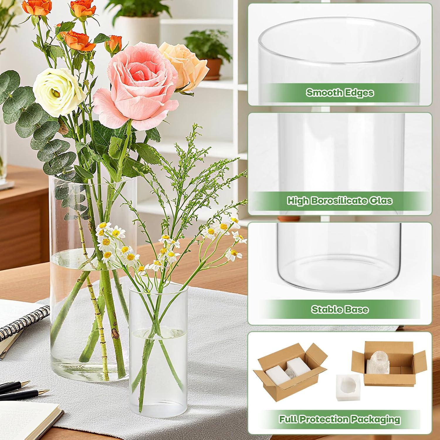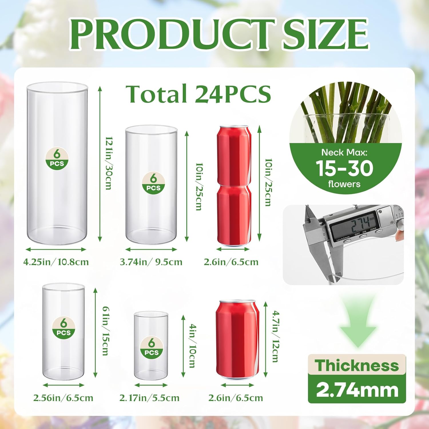 - 24PCS 4-Size Cylinder Vase Set: 24clear glass vases in 4 sizes (4"H x 2.2"W, 6"H x 2.6"W,10"H x 3.7"W,12"H x 4.3"W), 6 each.Perfect for diverse needs:flower arrangement,candle holders,home decor,party,wedding,office desk decor and more