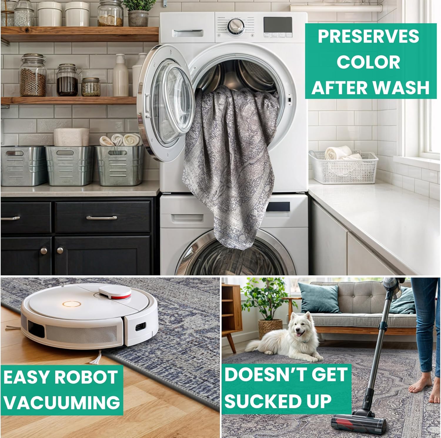 - MACHINE WASHABLE: Machine wash on delicate cycle (do not use bleach) at 85°F (30°C) and line dry or dry on air-only cycle without heat. Vacuum regularly and spot clean small stains. This easy to clean rug is perfect for families with kids and pets, and for high traffic areas.
