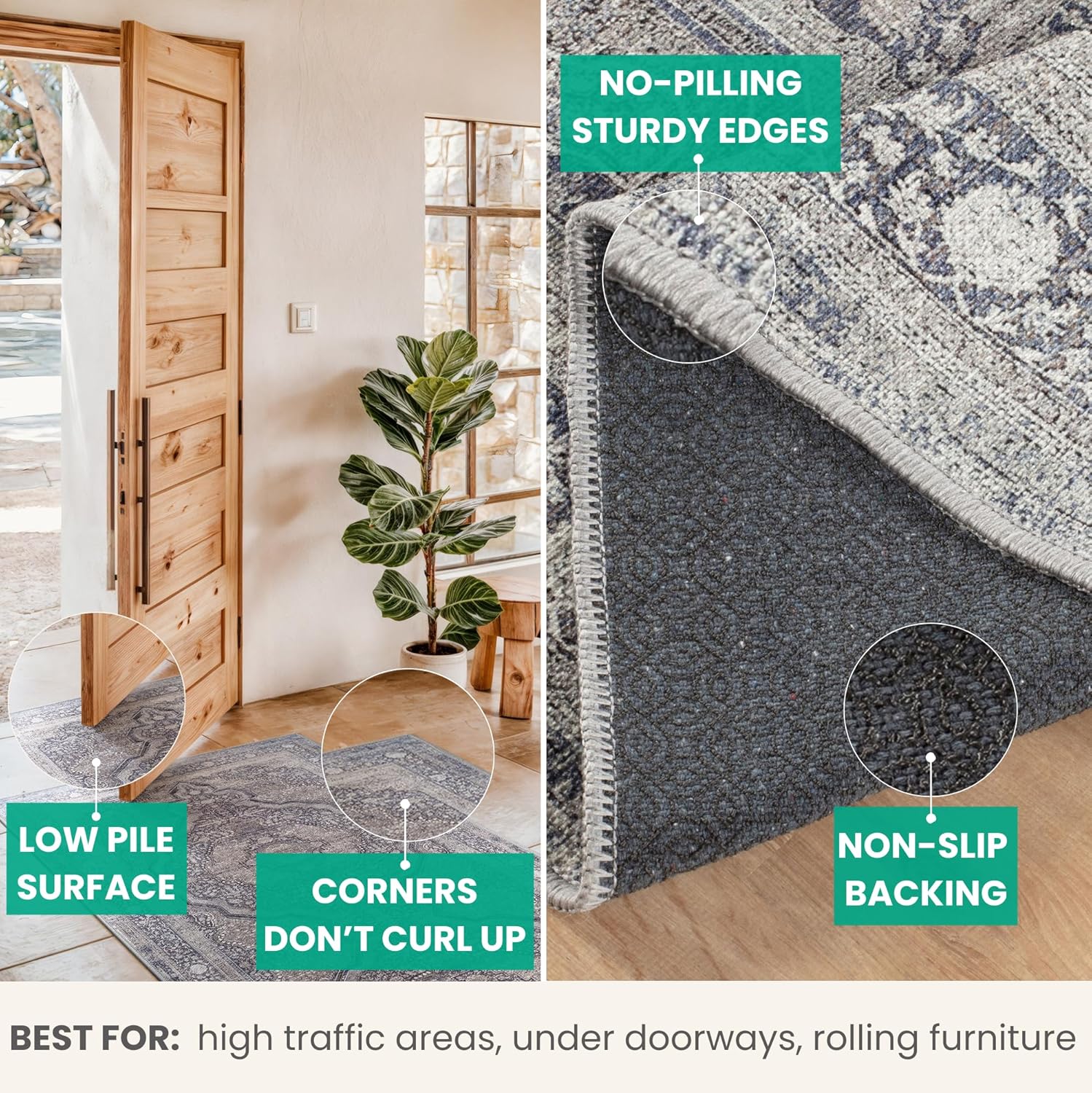 - EASY TO SETUP AND NON-SLIP: This one-piece machine washable rug with non-slip backing attached eliminates any additional setup. Simply unfold and lay flat upon arrival in the desired space. Non-slip backing prevents the rug from moving or sliding without the need for additional rug pad or grippers.