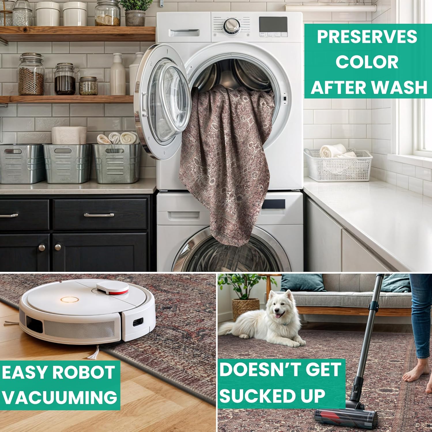 • MACHINE WASHABLE: Machine wash on delicate cycle (do not use bleach) at 85°F (30°C) and line dry or dry on air-only cycle without heat. Vacuum regularly and spot clean small stains. This easy to clean rug is perfect for families with kids and pets, and for high traffic areas.